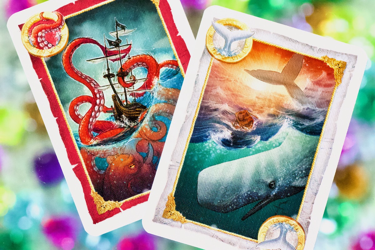 In the deck you’ll find four numbered suits, escape cards, and a variety of powerful “face” cards in the form of pirates, mermaids, and leviathans (such as the trick-destroying Kraken). The new edition of the game debuts a second nautical beast: the White Whale. Rather than destroying a trick, the whale completely capsizes everyone’s plans by essentially making the powerful face cards useless and forcing the highest number card to win, regardless of suit.