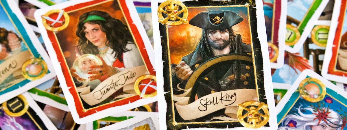 Skull King is a trick-taking card game in which players state how many tricks they think they’ll win each round, similar to Euchre or Spades. Bidding takes place simultaneously which often leads to over- and under-bid rounds (which leads to chaos – the fun kind).