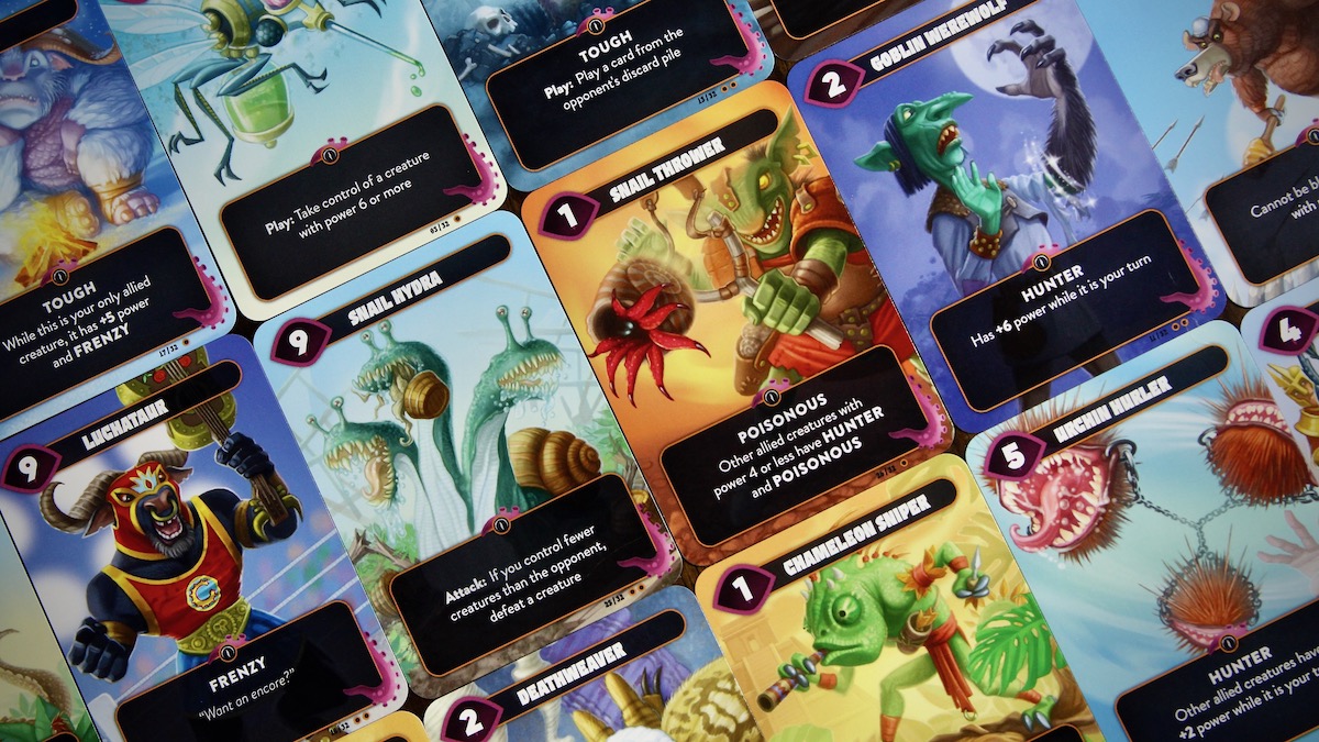 Most of the creature cards are associated with at least one of five keywords: Frenzy, Hunter, Poisonous, Sneaky, and Tough. These keywords grant special rules to the creatures during attack and/or defense actions and understanding how each work is crucial to building an effective strategy. There are also three keywords (Play, Attack, Defeated) that trigger effects at different times.