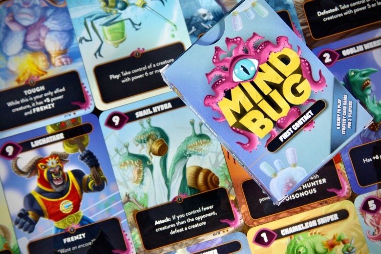 Mindbug: First Contact is a duelling card game by Christian Kudahl, Marvin Hegen, Richard Garfield, and Skaff Elias. The game consists of a deck of 48 creature cards, four Mindbug cards, and a rules sheet all contained in a small tuck box.