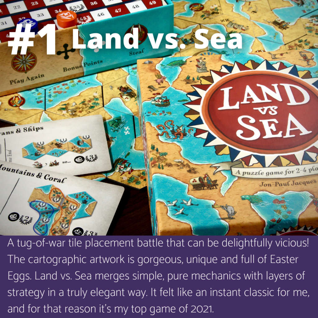 Simple mechanics do not always equate to simple choices and this game demonstrates that beautifully. This game positions its players in a tug-of-war tile placement battle that can be delightfully vicious! The cartographic artwork is gorgeous, unique and full of Easter Eggs. It’s a beautiful to look at and play. Land vs. Sea merges simple, pure mechanics with layers of strategy in a truly elegant way. It felt like an instant classic for me, and for that reason it’s my top game of 2021.