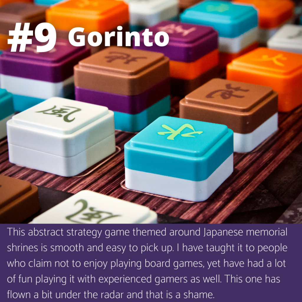 Gorinto has been a pleasure to play. In this abstract strategy game themed around Japanese memorial shrines players must collect elemental tiles from a shared space and use them to build stacks to score points. Although the theme is pretty thin, the game play is smooth and easy to pick up. I have fun playing this with people with a wide range of experience. It’s accessible yet still engaging to experienced gamers. This one has flown a bit under the radar and that is a shame because it is a lot of fun.