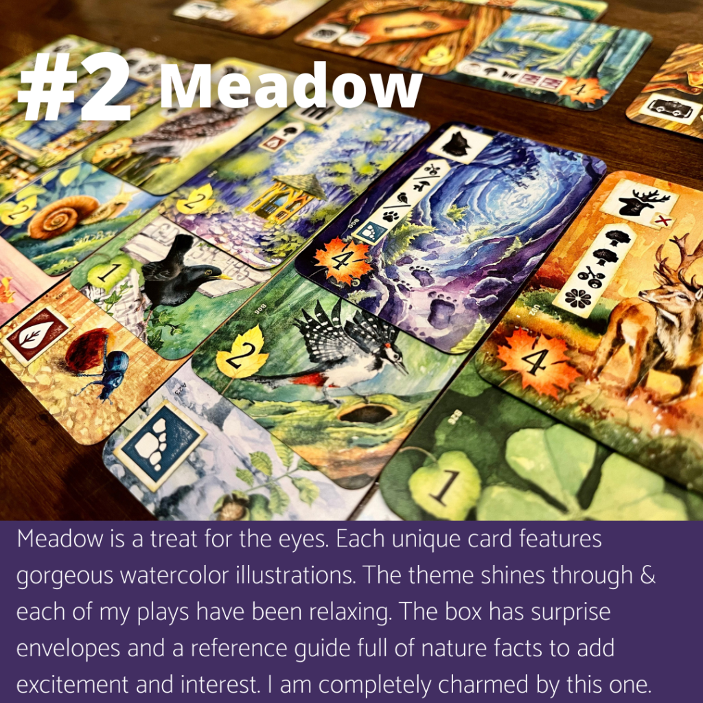 Meadow is a treat for the eyes. Each card in the games features a unique, gorgeous watercolor illustration. It is a game that gives each player the chance to build something beautiful. I truly enjoy the experience of collecting creatures and items on my imaginary walks. The theme shines through and it’s extremely pleasant to play. The box has surprise envelopes and a reference guide full of nature facts to add excitement and interest. This is by far the coziest game on the list. I just am completely charmed by this one.