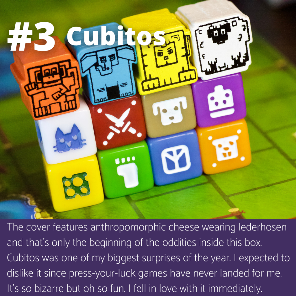 The cover features a block of anthropomorphic cheese wearing lederhosen and that’s just the beginning of the oddities inside this box. Cubitos was one of my biggest surprises of the year. I went into my first game expecting to dislike it. After all, it’s a combination of two mechanics I tend not to enjoy: push your luck and racing. After the first game I immediately wanted to play again. It’s bizarre, it’s colorful, and it’s extremely enjoyable. Cubitos is a game you shouldn’t think too hard about – just roll with it.