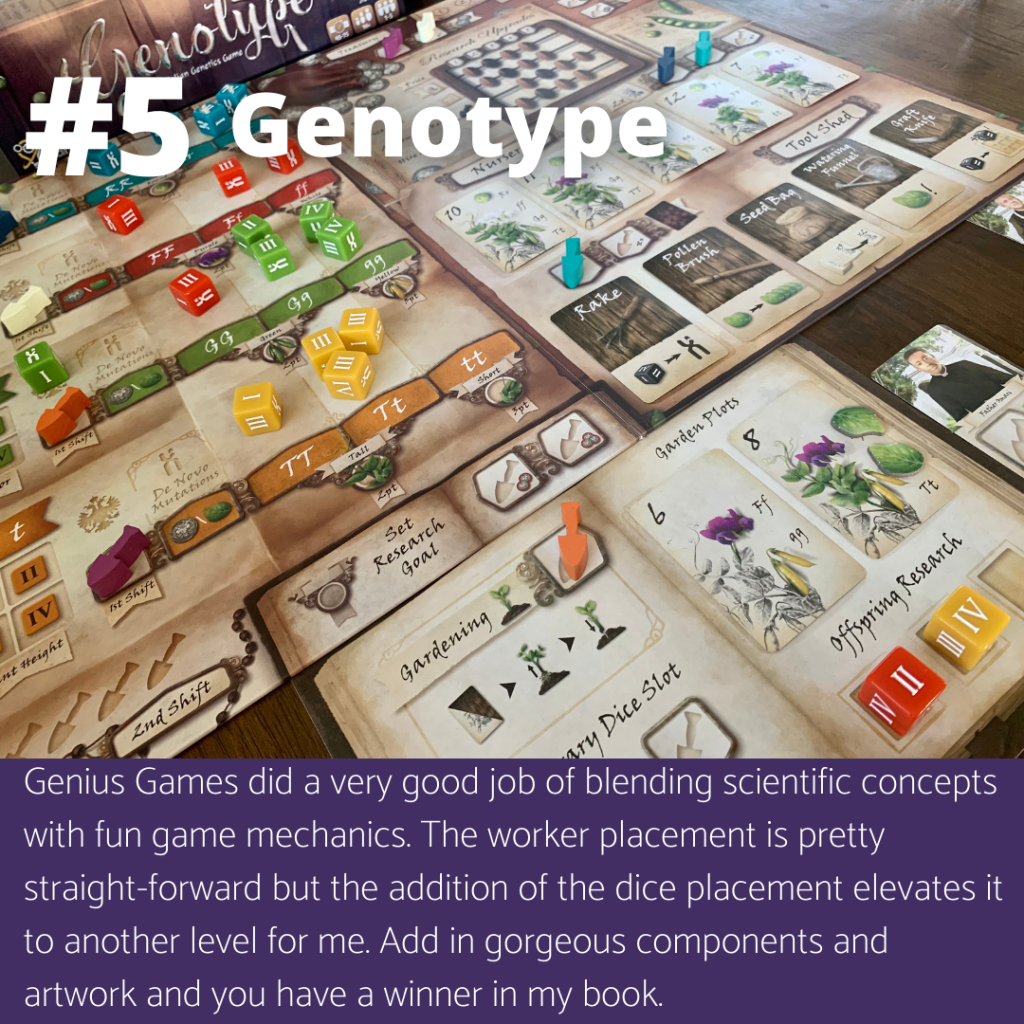 Genius Games did a very good job blending scientific concepts with fun game mechanics. Although the worker placement is pretty straight-forward, the addition of the dice placement and manipulation really elevates it to another level for me. Add in gorgeous components and artwork and you have a winner in my book. Who knew that breeding pea plants could be so much fun?