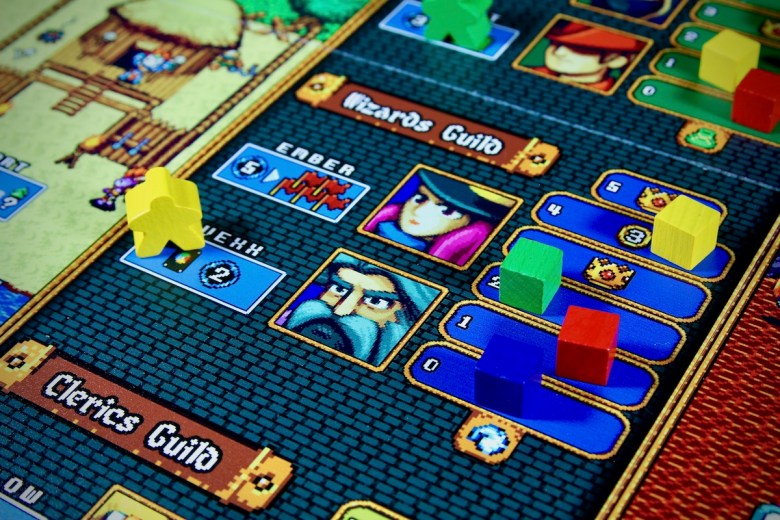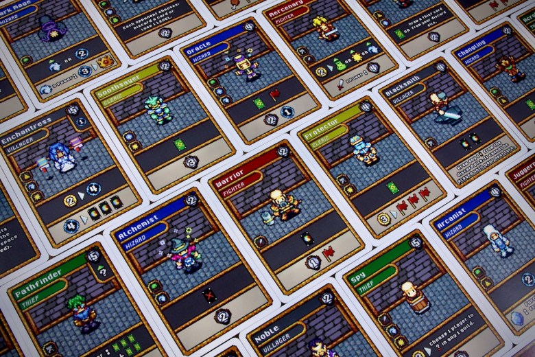 The art in this game is totally charming. The colors are vibrant, the scenes are detailed and full of little surprises for anybody willing to investigate. The board itself is beautiful on the table and the cards provide plenty of eye candy as well. I grew up playing a lot of Final Fantasy on my SNES so the 16-bit style artwork in this game was perfect for me. Younger players may have fun finding references to newer titles such as Stardew Valley which are also present in this game. There is so much to discover on the cards and on the board, and I think that gives the game a lot of heart. I don’t prefer the cover art on the box but it looks like it has been updated since my copy arrived. The other components are fine – the meeples, cubes and gems are pretty generic but functional. Overall this is a nice production.