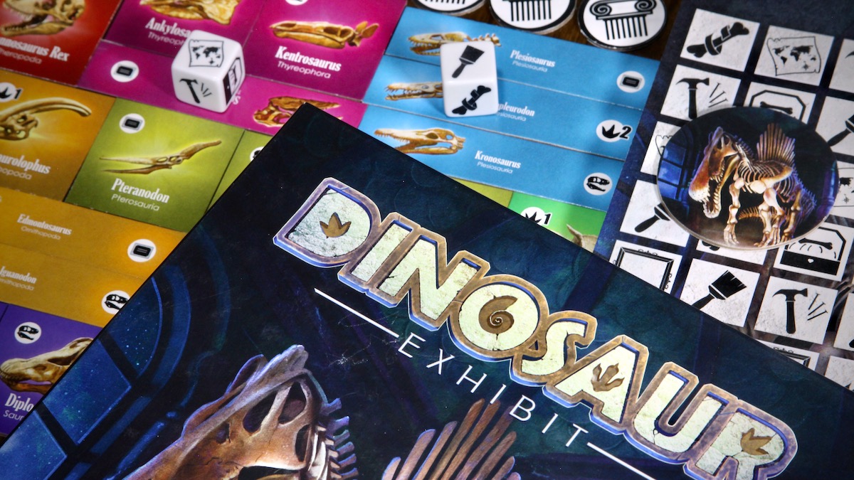 The cover art by Jerry Padilla features a lovely Spinosaurus fossil – the crown jewel that all the museum curators are competing for in the game. Although the game I played was only in prototype form and subject to change, the components were were very nice and functional. The tiles are bright and color-coordinated by fossil classification and the symbology is clear. The exhibit map pad is thick and full of double-sided maps (the back being slightly different in order to mix up the game somewhat). The dice and colorful tiles are especially appealing to children without having any “cheap toy” gimmicks that some games aimed at this audience default to. Overall this seems like a nice production for children’s game.
