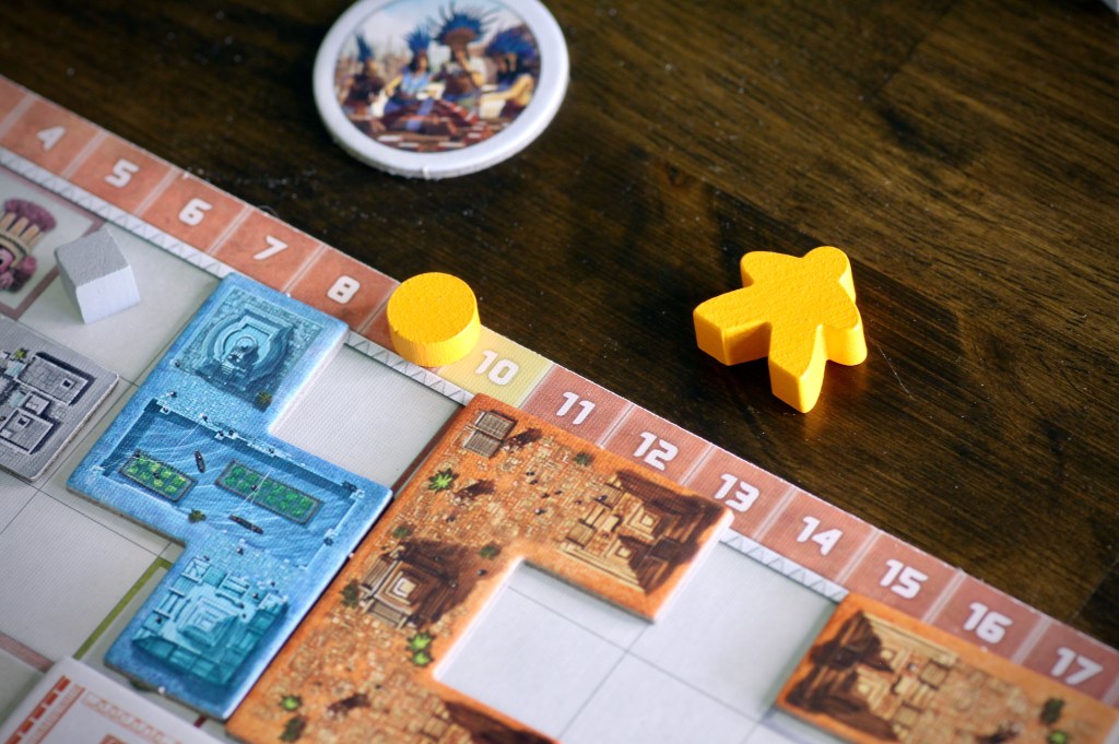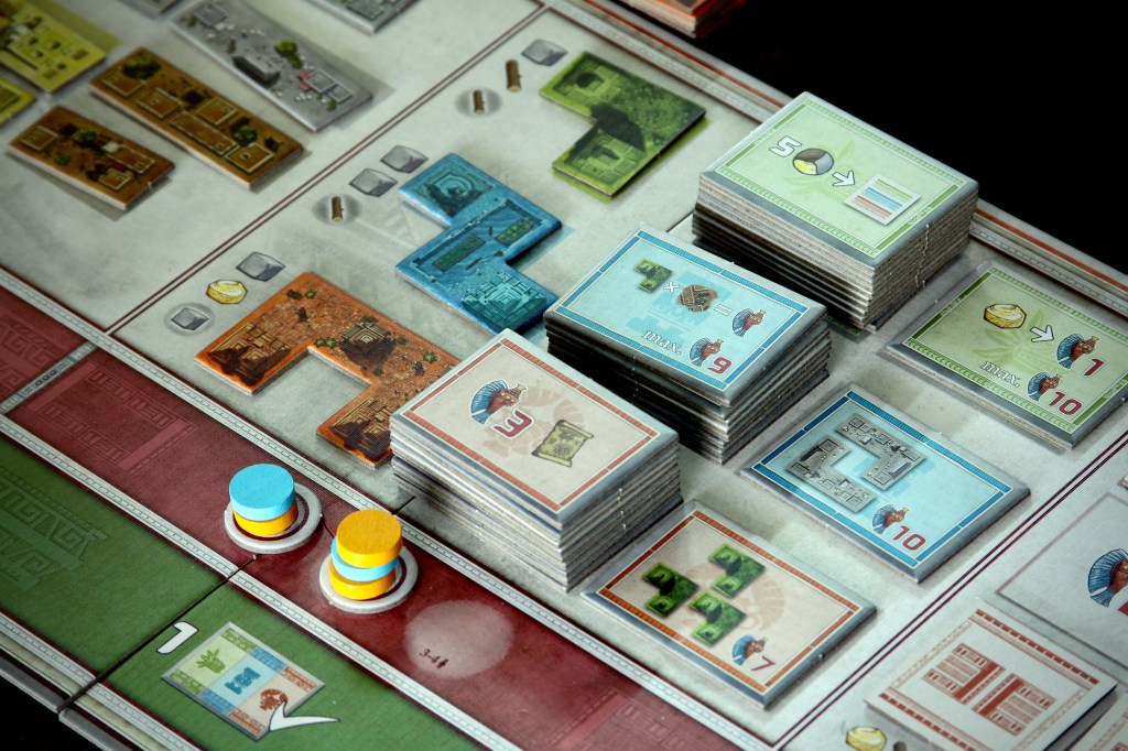 The pyramid construction offers a unique take on tile-laying and works well with the ancient Mesoamerican theme. The addition of polyomino-shaped buildings and temples throughout the city seems to make sense in the context of the game. Ultimately this is a Euro-style strategy game and for me the theme disappeared once I was immersed in the strategy of the game.