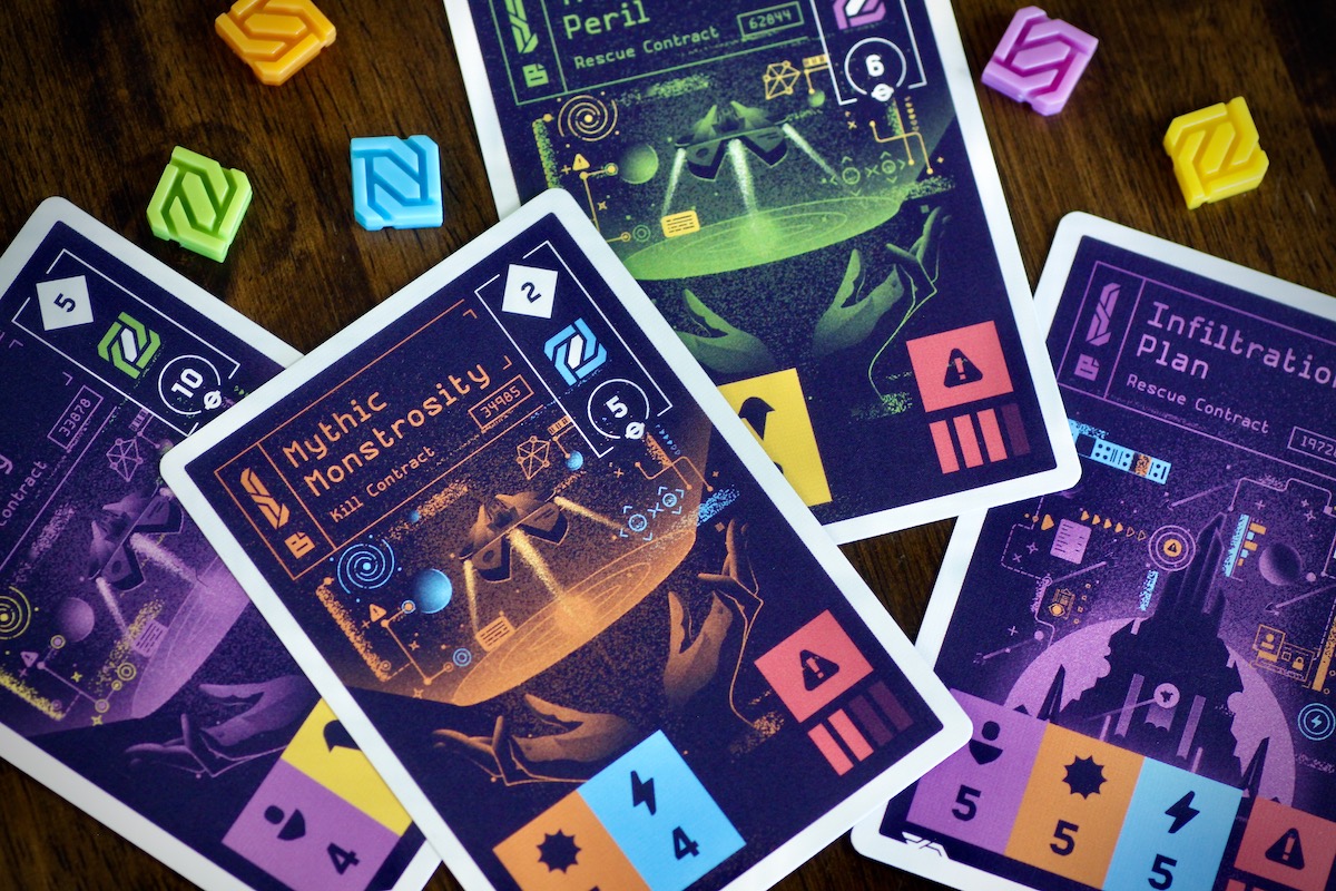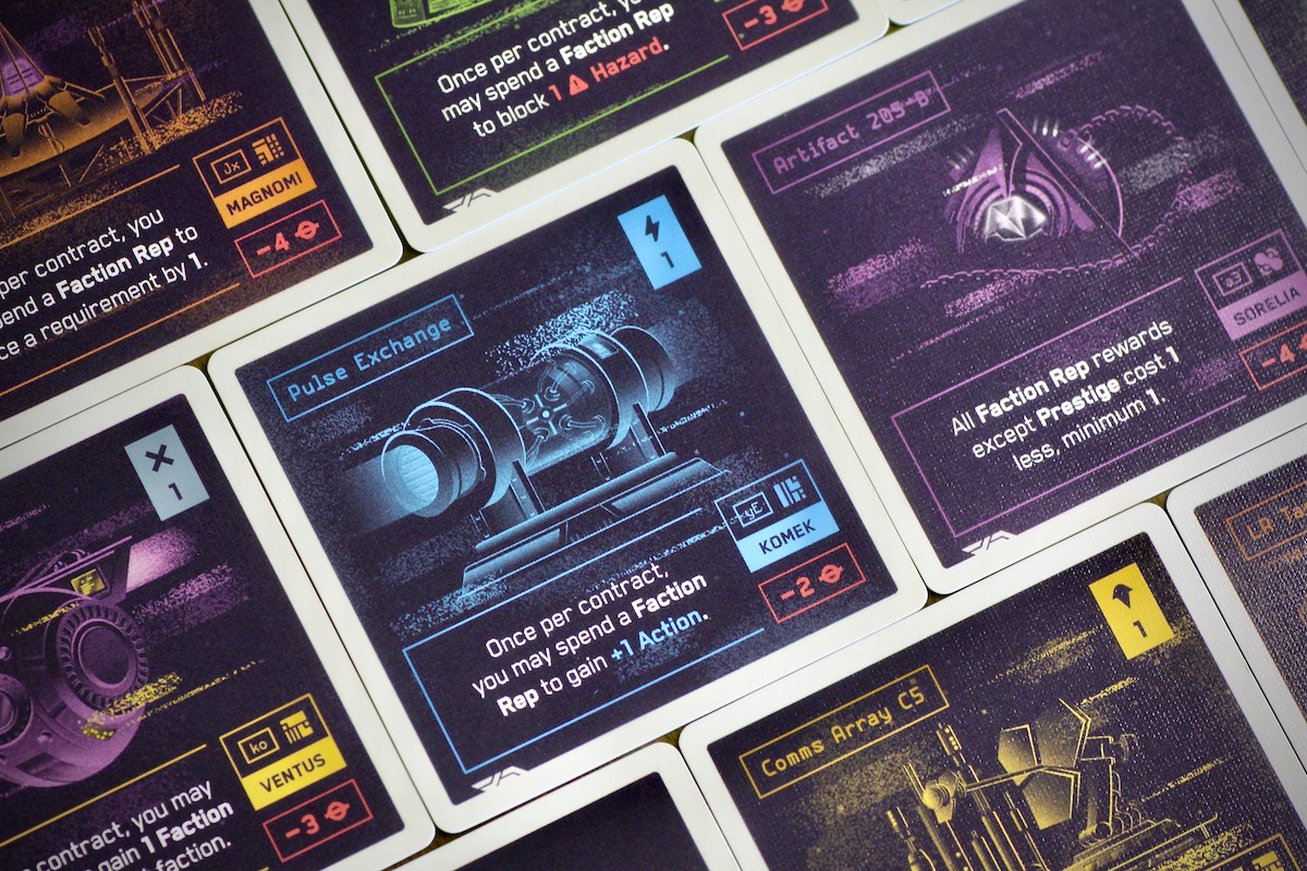 This expansion adds a Faction Reputation economy to the game that encourages cooperation. By completing contracts with opponents, players gain Faction Reputation (or “Faction Rep”) with those allies. Faction Rep is a form of currency that is spent on many benefits, such as increasing Credits, adding an action or card draw, blocking a Hazard Die, and bumping up the Prestige track, to name a few options. Failed contracts will cause players to lose Faction Rep, so it is important to choose your allies wisely.
