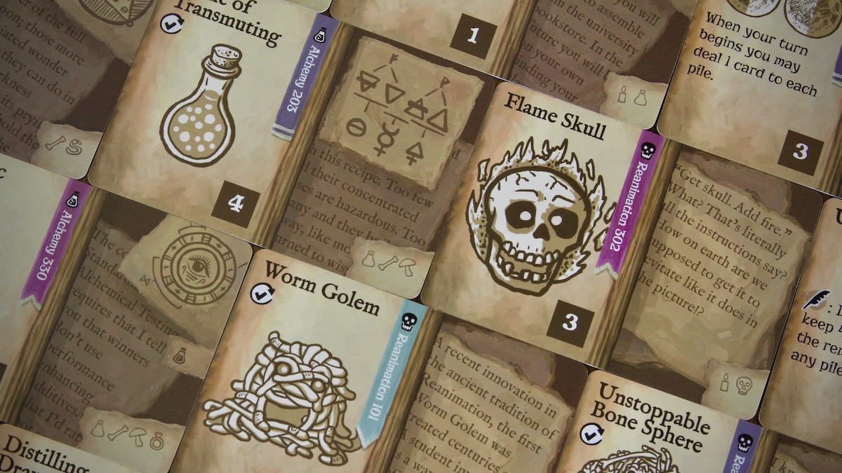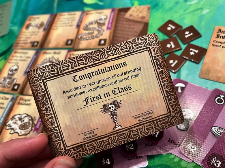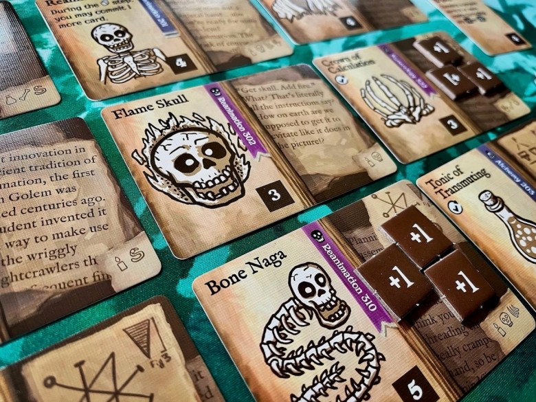 Players affect each other indirectly in this game. Generally, you won’t have to pay close attention to your competitors’ coursework (there are a few exceptions). It can feel a bit like multiplayer solitaire. The most interaction happens in the graveyard as players try to time their dig actions. Should you look at that big pile of cards in the graveyard before somebody else takes it? If so, you might have to wait to purchase a project crucial to your strategy, which opens the possibility of losing the project. It’s tough decisions like these that make the game interesting.