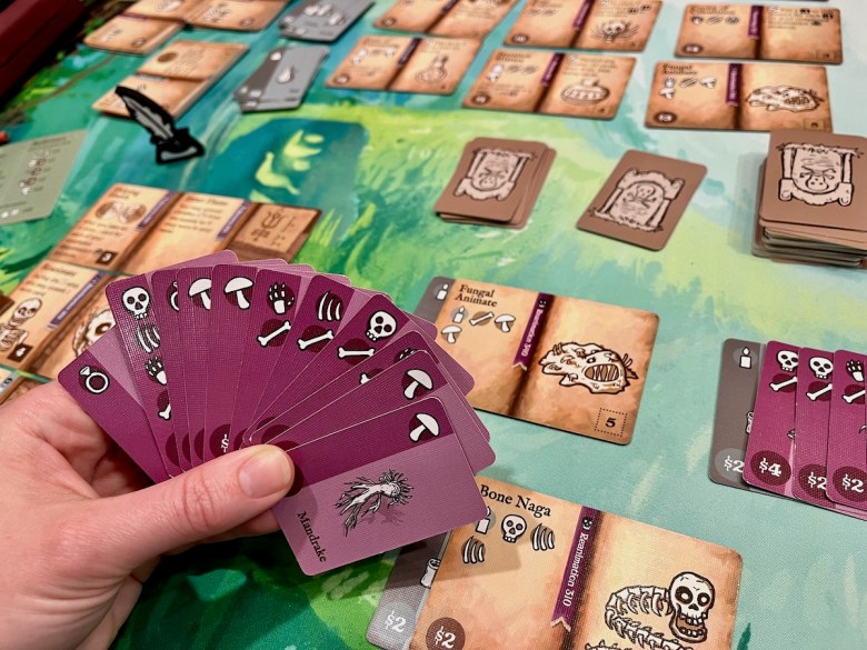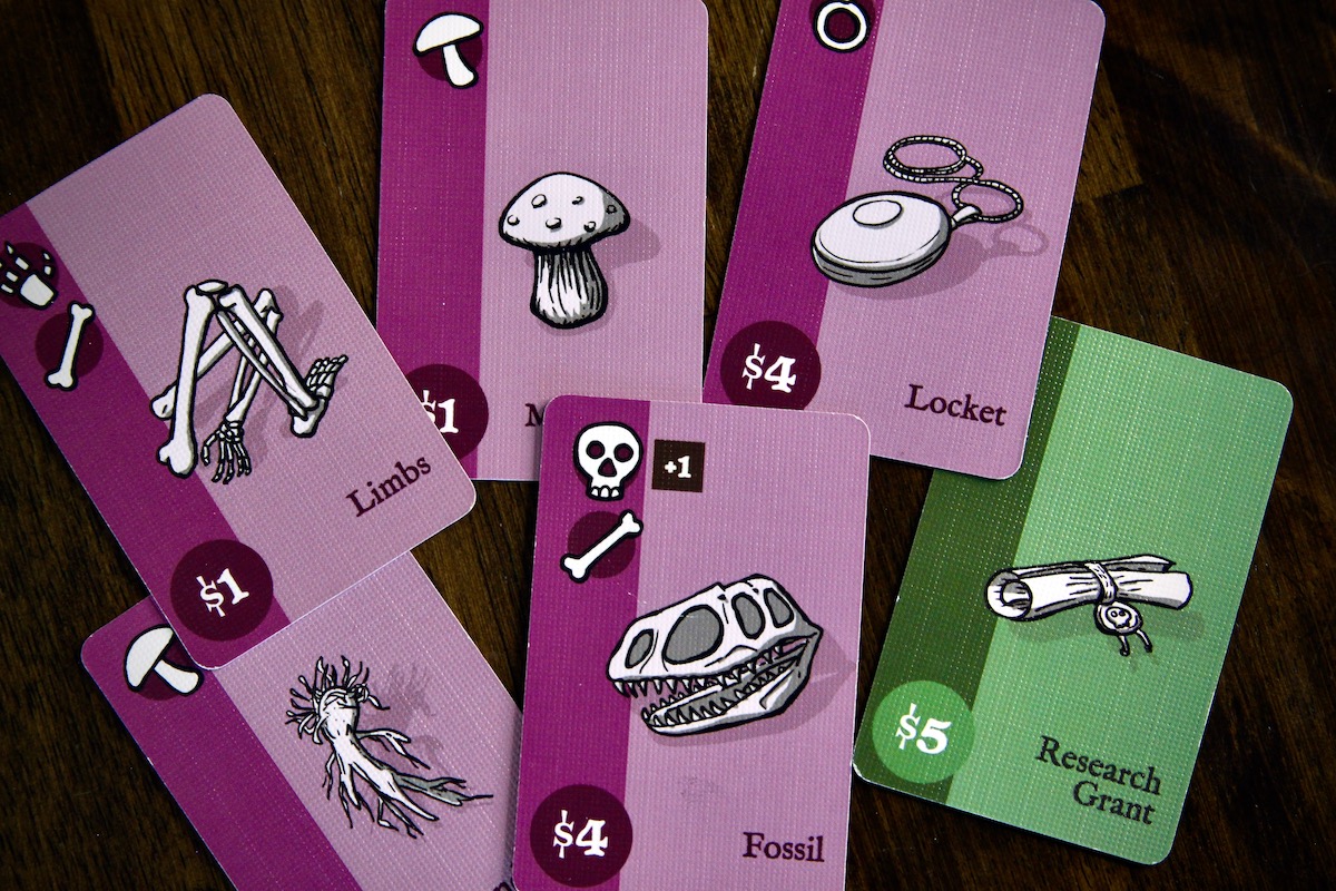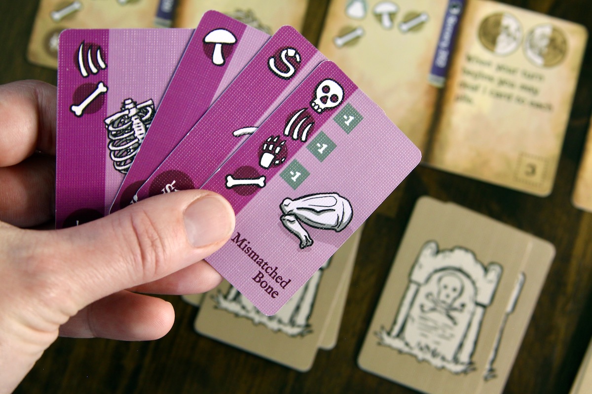 There is a bit of randomness in the gravedigging. It is possible to spend a few rounds trying to find the ingredients you need only to come up with a few measly earthworms. Fortunately, pushing your luck will never end in a complete bust here. Nobody goes home empty-handed. Material cards have a monetary value and may contribute to end-game victory points, so it doesn’t feel terrible to have a disappointing dig. Of course, some digs will be quite lucrative. The possibility of finding good loot in the graves adds excitement to the game.