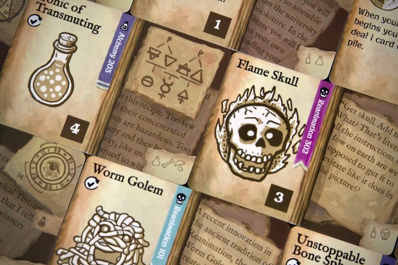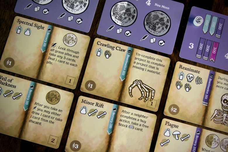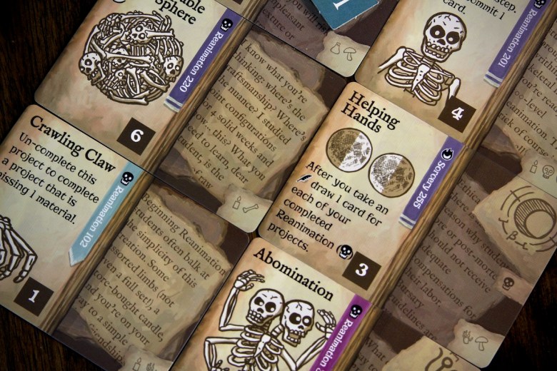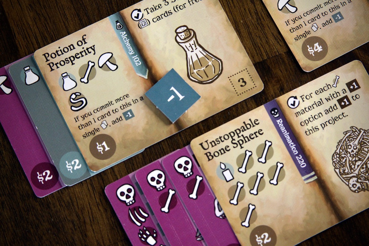 The semester consists of four months, with four moon phases each. Each moon phase grants players a turn to dig for materials, commit the materials to their projects, purchase stock materials or enroll in new classes. Projects require materials such as earthworms, fungi, and bones for completion. These unsavory ingredients are found in the graveyard (piles of face-down multiuse ingredient cards). If your first dig attempt doesn’t yield what you want, you may choose to push your luck by forgoing that plunder and checking a new grave. Materials can be used as currency to purchase new projects and stock materials, so sometimes taking a large pile of ingredients is worthwhile, even when it doesn’t contain what you want.