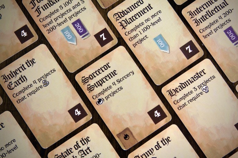 Studies in Sorcery does a good job integrating the theme and mechanics cleverly. The Semester Track acts as the game timer and adds a sense of urgency to project completion, particularly late in the game. At this point that players tend to use the Cram action to assign as many materials to projects as possible in a frenzy to finish their thesis, which emulates the student experience perfectly. The addition of extra credits and demerits is also a nice touch.