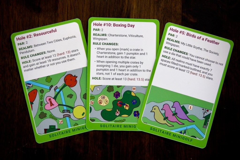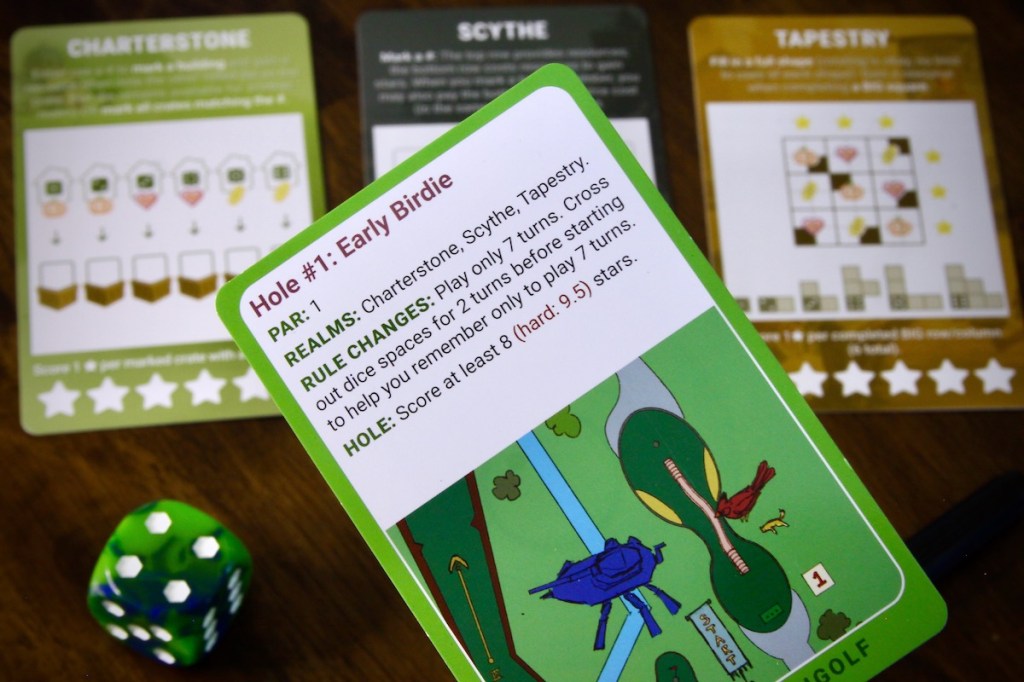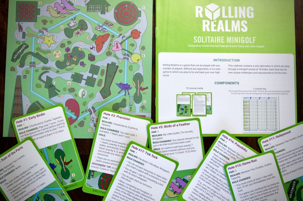 There is virtually no player interaction in this game and when played with multiple players fits the definition of “multiplayer solitaire.” I am not much into solo gaming but would consider giving the solo mode on Rolling Realms a shot because it seems well thought-out (plus the mini-golf theme is attractive to me).