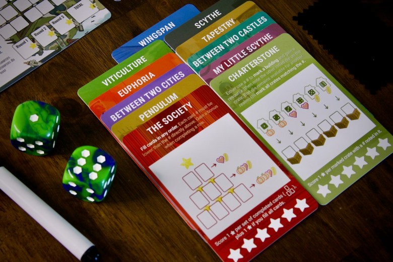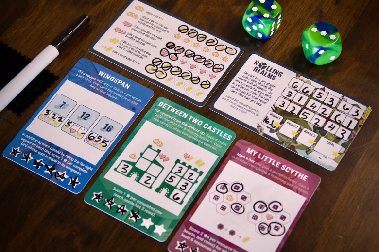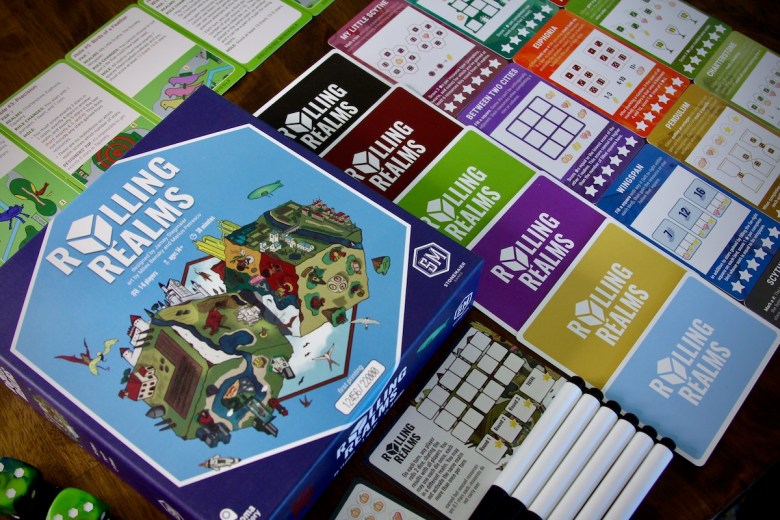 Rolling Realms is a roll-and-write game utilizing two dice and several dry-erase mini-game realm cards. It takes place in the Stonemaier Universe – each realm card represents a game in the catalog.