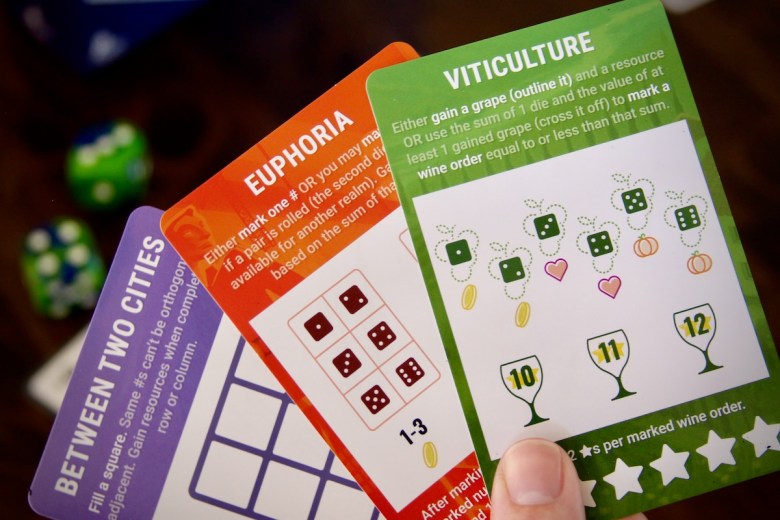 The theme of Rolling Realms is self-referential – each realm card refers to a title in the Stonemaier Games catalog. And each realm card has a unique mini-game that attempts to capture the essence of some component of that game. For example, the Viticulture realm card allows players to mix and match grapes to create wine, and Scythe has a top row/bottom row action.