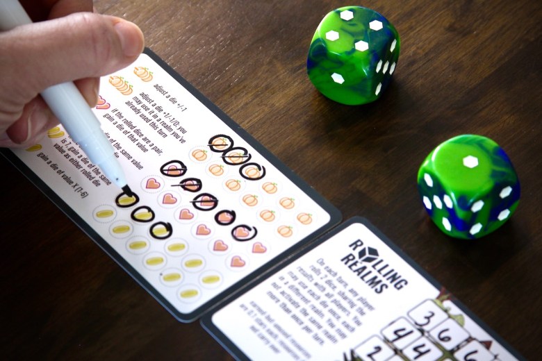 Early in the coronavirus pandemic, many people worldwide were isolated from friends and loved ones. Simple pleasures such as gathering with a group of friends for a game night were difficult, if not impossible. In response to this challenging time, the founder of Stonemaier Games created a game that would be infinitely scalable and easily playable in a video conference setting. He decided to offer his work as a free print-and-play game to bring some joy and connection during those lonely days. This is how Rolling Realms came to be, and now it exists in a physically published form.