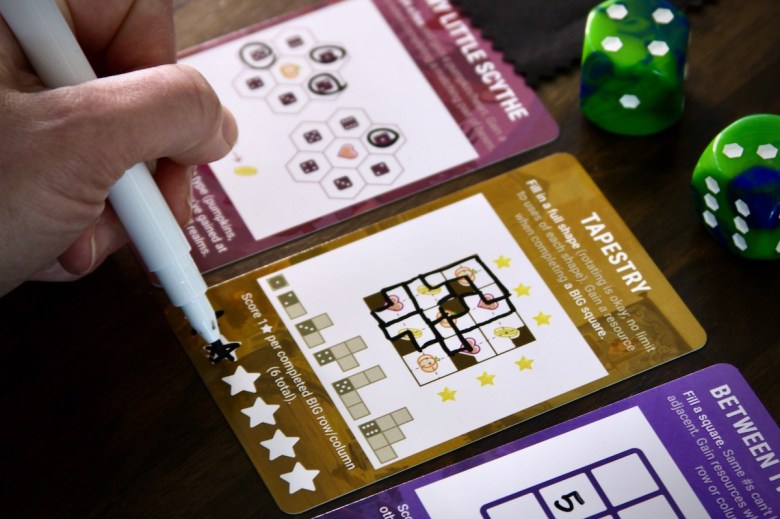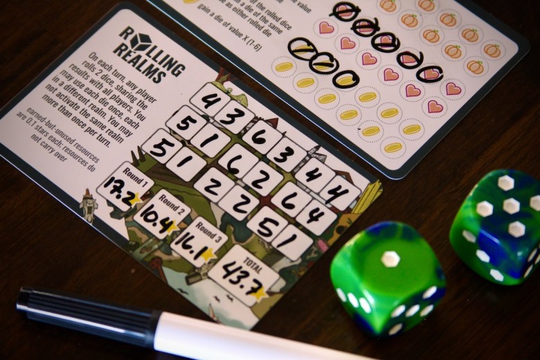 Stonemaier Games are known for their above-average component quality, and Rolling Realms is no exception. The game started as a free print-and-play and now is a polished gem. I especially appreciate the laminated realm cards because dry-erase is usually my preference for a simple roll-and-write game. I had one minor gripe with game components: I was not a fan of the oversized dice. That’s just a personal preference – it doesn’t affect the gameplay.