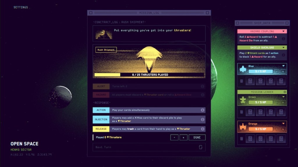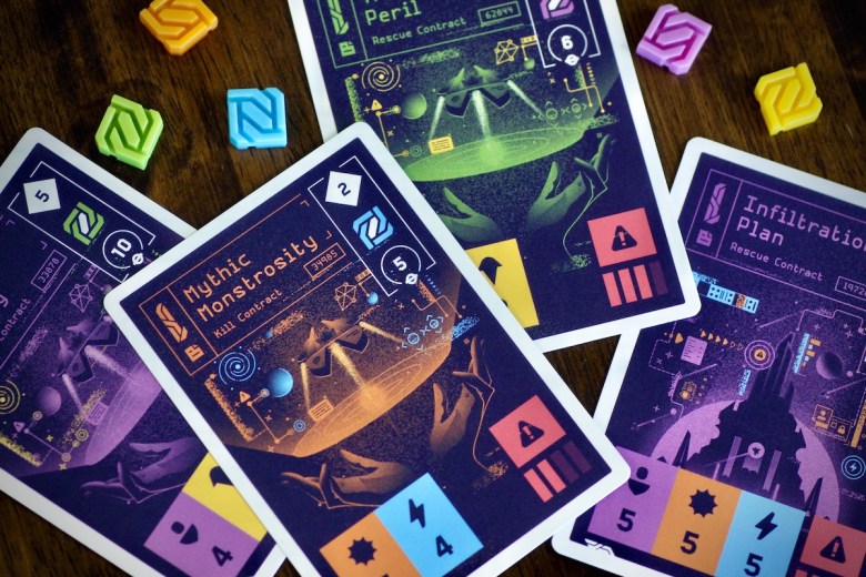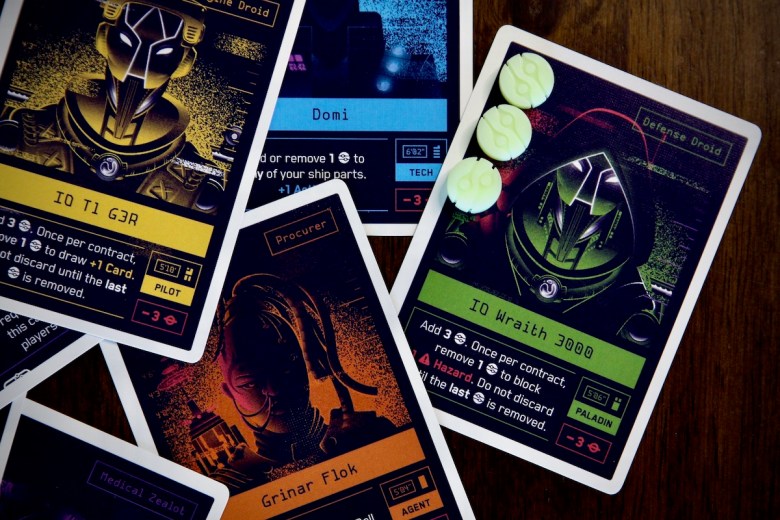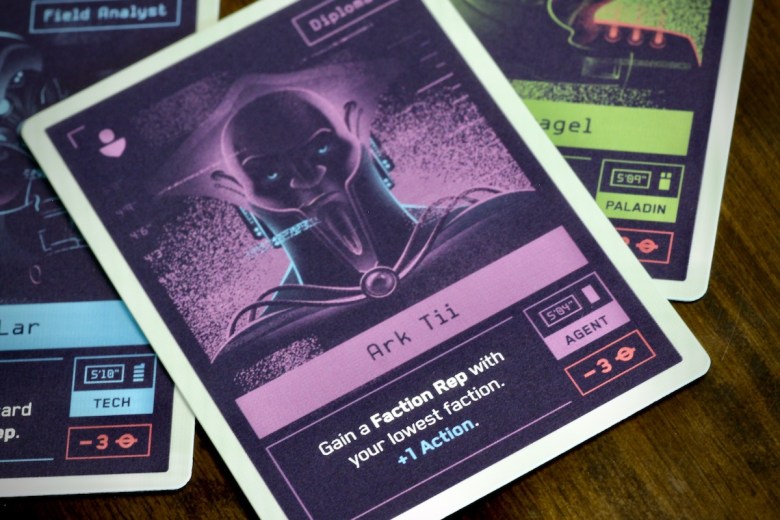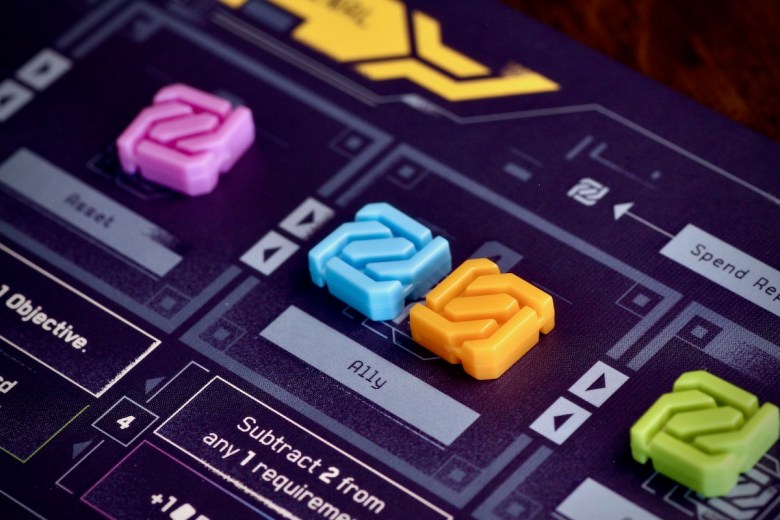 Binding Ties adds an economy to the game that encourages cooperation. By completing contracts with opponents, players gain Faction Reputation (or “Faction Rep”) with those allies. Faction Rep is a form of currency that can be spent on many benefits, such as increasing Credits, adding an action or card draw, blocking a Hazard Die, and bumping up the Prestige track.