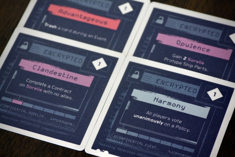 Nomad also adds Global Events to the game. An event might force you to travel to a different sector, or offer you a benefit based on a dice roll. My favorite events are the Policies that allow players to vote on new rules. The injection of democracy works thematically with the game and adds additional interaction.