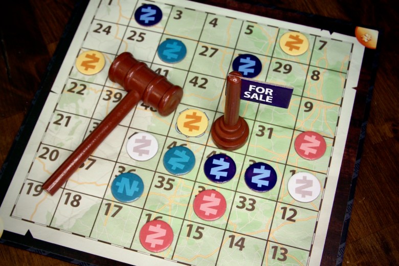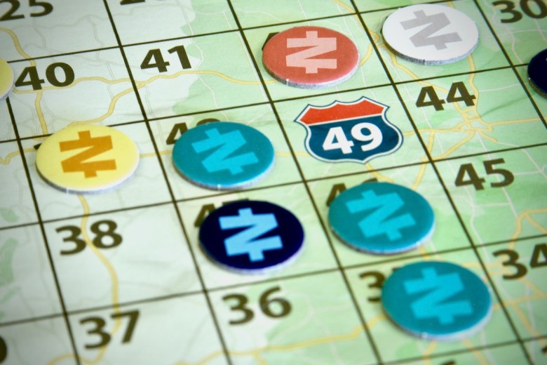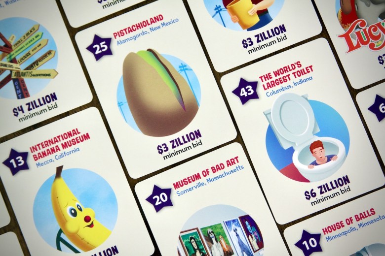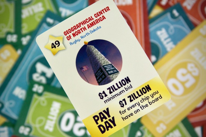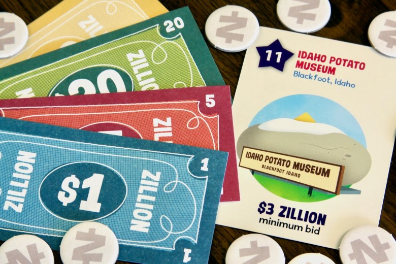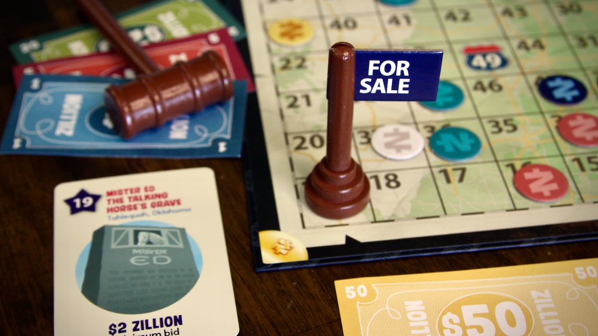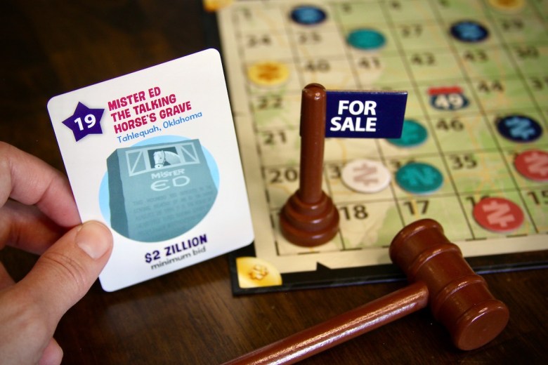 Players begin the game with $49 zillion and “Sold” chips in their chosen color. The game consists of a 7×7 grid board marked with numbers and a deck of roadside attraction cards that correspond to grid locations. Every round a property card is revealed and players take turns bidding on location. Whoever is willing to spend the most gets to claim the space. The goal is to own four properties in a row (just three in a 5-player game), either vertically, horizontally, or diagonally.