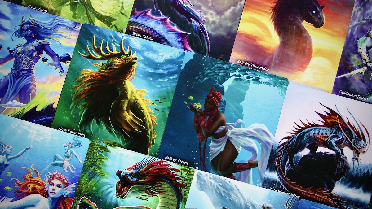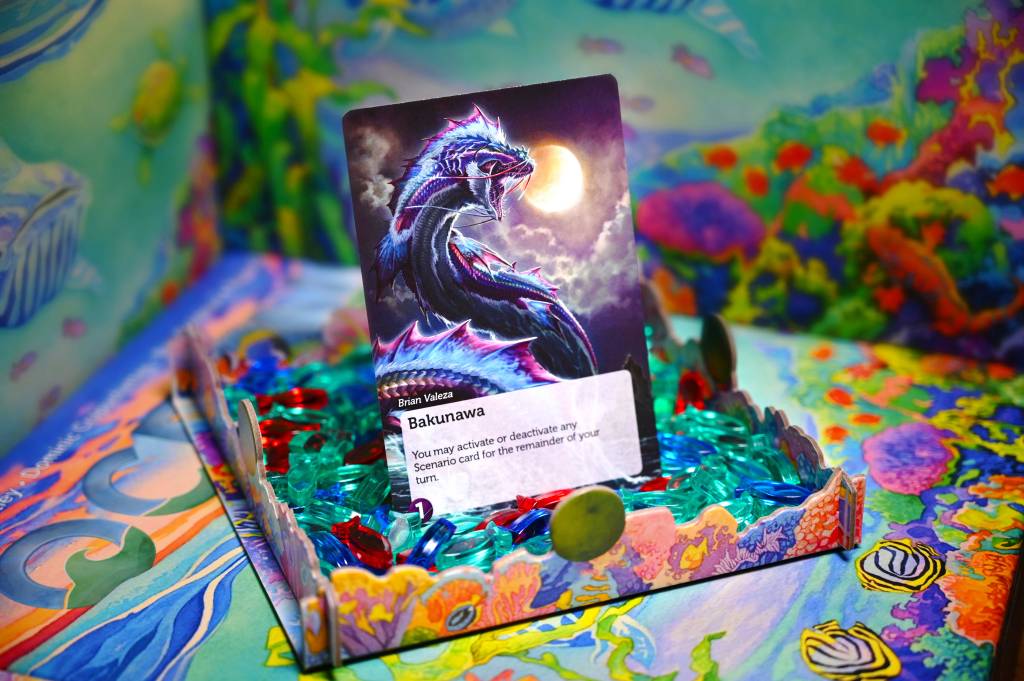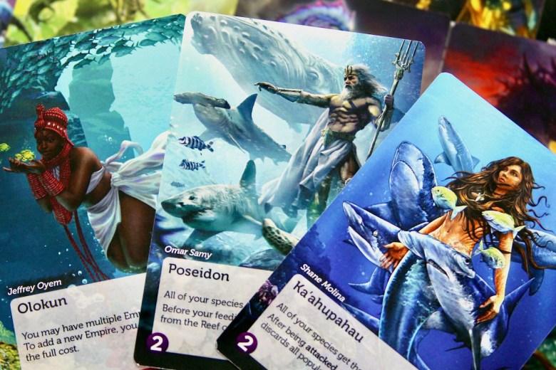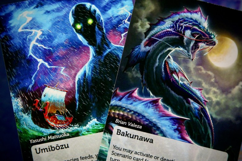 Legends of the Deep is an upcoming expansion for Oceans that introduces a bit of fantasy into the scientific ecosystem. It includes a deck of Legend Cards – beautifully-illustrated tarot-sized cards depicting a variety of divine creatures with powerful abilities. Many of these cards take inspiration from cultural myths around the globe.