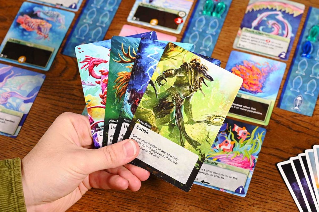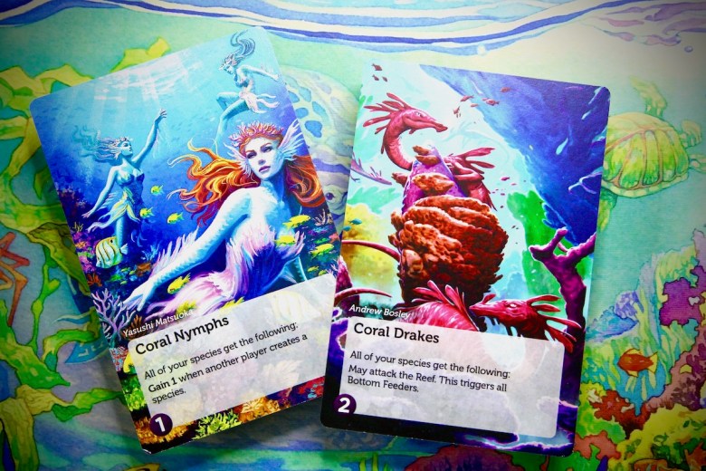 I am pleased to say that my concerns were put to rest after my first play. Despite the mystical slant, these cards essentially acted as Deep Cards+. The artwork and theme of the expansion have a fantastical tone, to be sure. To justify this, I imagine my section of the ocean as influenced by a unique culture or mythology that ties all the species together. I never felt these myths interfered with nor distracted me from the game’s core purpose. This remains a science-themed experience that revolves around balancing an intricate ecosystem and healthy population management. Biology still rules these waters.