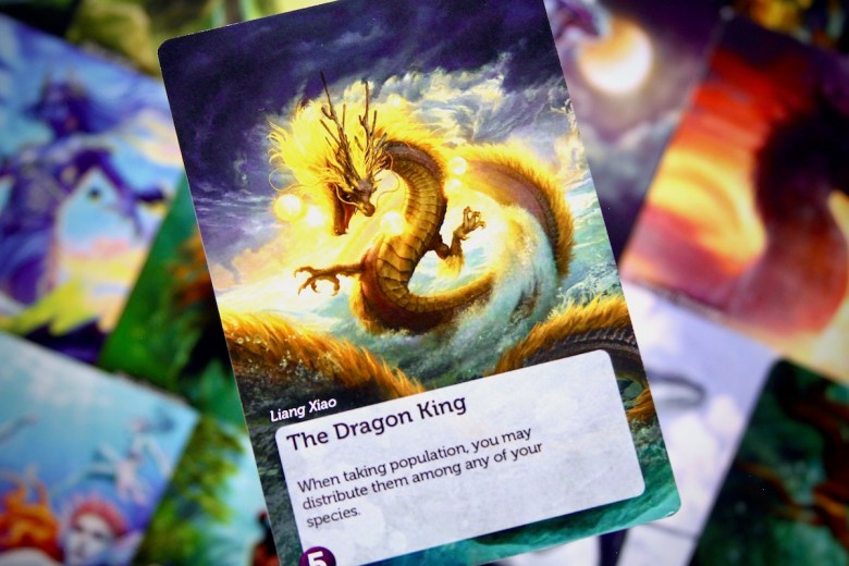 Several notable artists were commissioned to illustrate the tarot-sized Legendary Cards, and the result is stunning. Despite the number of artistic contributors, these cards share a similar style. The base game (and from what I can tell, the entire Evolution series) features vibrant, watercolor-style art that reminds me of batik fabric. It is very distinctive and gives the game a unique visual identity. The new Legendary Cards do not share this art style. To be fair, this issue is present in the base game as well – the Deep Cards are not always visually cohesive with the Surface Cards. This doesn’t bother me but I feel it’s worth noting.