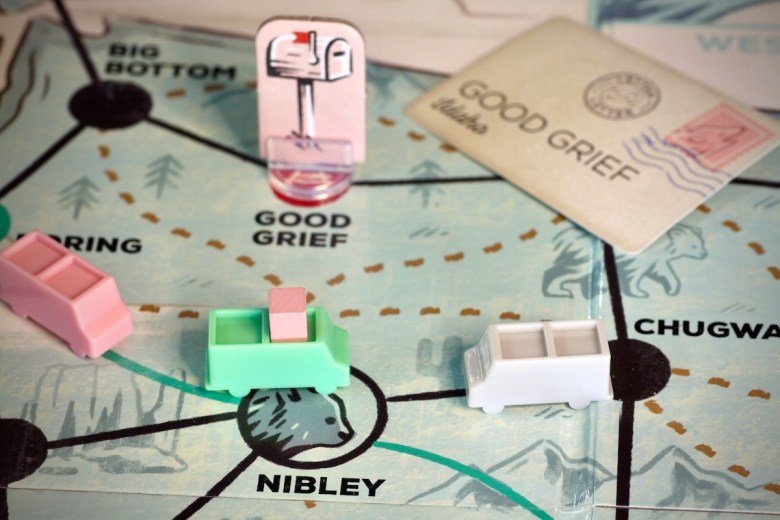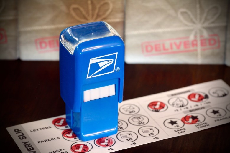 Fun is infused into nearly every high-quality component. The shiny board is full of the oddest town names you could imagine – it’s near impossible not to smile when delivering a package to Booger Hole, WV. The postcards are full of jokes and puns that delighted my children. But the star of the show is the ink stamp. Fashioned in the style of the iconic blue collection boxes, this rubber stamp was functional and irresistible to all at the table. My kids had struggled to resist the urge to stamp red checkmarks all over their bodies.