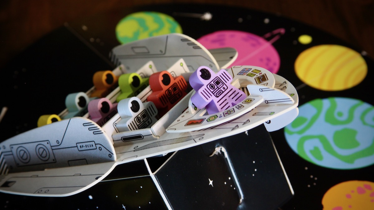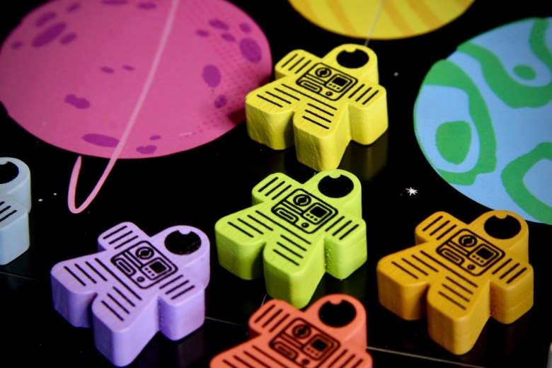 I like the components. The rocket ship attracts attention. Both the ship and the planet board aren’t necessary, but are nice touches that add to the table presence – I appreciate them. The screen-printed astronaut meeples look fantastic, but I wish the colors on some of them were brighter (the pink and purple meeple get mixed up a lot).
