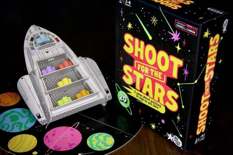 Shoot for the Stars‘ gameplay relies on pushing your luck in a bidding war for the captain’s seat. Taking risks by shooting for high numbers may yield more points and scare other passengers off the ship. But if the captain pushes the answer too high, they alone suffer the penalty.