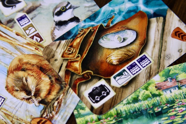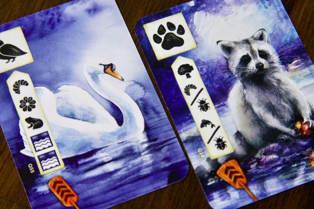 River cards work similarly to the other observation cards – they have play requirements and add symbols that serve as the foundation for additional card plays. These cards do not grant points – instead they afford kayak movement, represented with an oar symbol. Although these cards don’t add points directly to the meadow, they offer plenty of indirect point opportunities. Bonuses can be collected along the path, and strong paddlers may even make it to the end of the route and which offers a significant end-game point load.