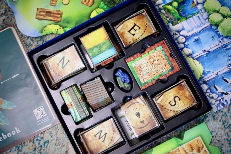 The expansion comes with a double-sided river board that nestles up to the campfire board. There is a new drafting area for the 55 river cards included, watery ground cards, and kayaker markers that are used for traveling downstream. In addition, there are new card types and tokens, 12 observation cards to be shuffled into the original decks, solo play cards, and a bonus envelope.