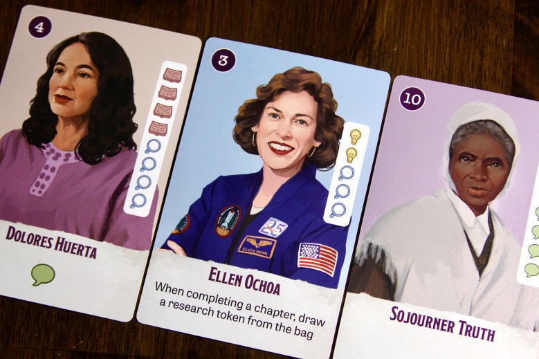 The production quality is fantastic with premium components and beautiful art. And the theme is beautiful and important. No matter your political or philosophical leanings, there is probably a card or two in here you will not appreciate, but hopefully, many more that you do. I encourage consumers to not assume that this is a game full of 120 role models – that is a very personal choice. Instead, I look at it as a game of 120 real, human (note: not infallible) women with different life experiences and different perspectives. There are women in here that are heroes to me, and others… not so much. Even when I disagree with the person’s philosophies and methods, I can still appreciate the monumental difficulties they faced to change the world and I do not begrudge their inclusion in the game. Most significantly: there are many women featured that I have never heard of. Some of their stories captured my kids and me, leading us to the internet for further knowledge. If a game sparks that desire to educate yourself further, that is incredibly valuable.