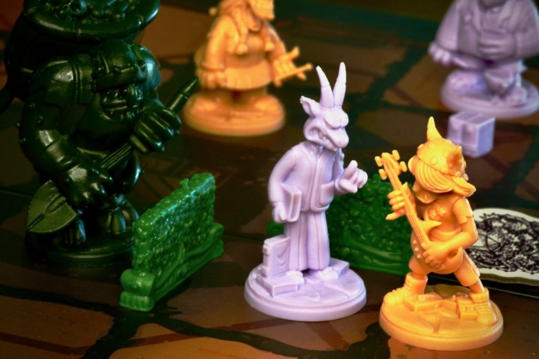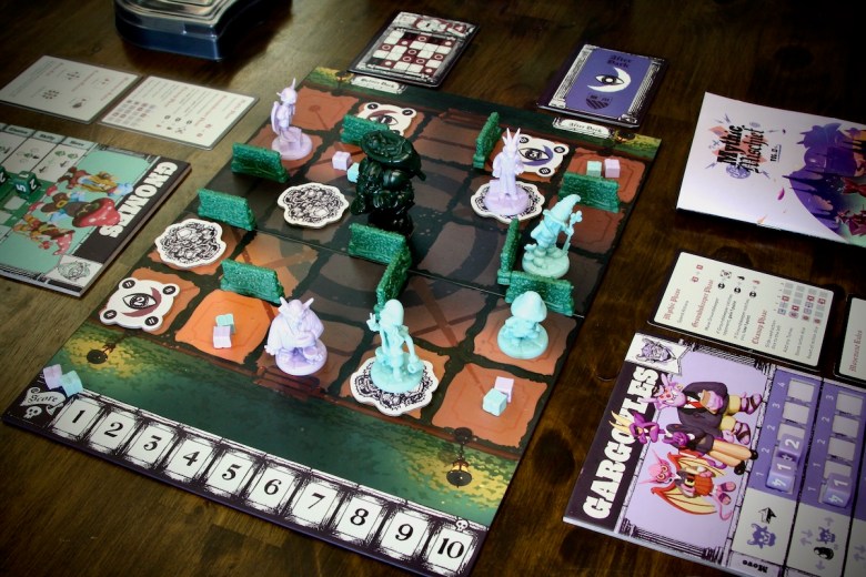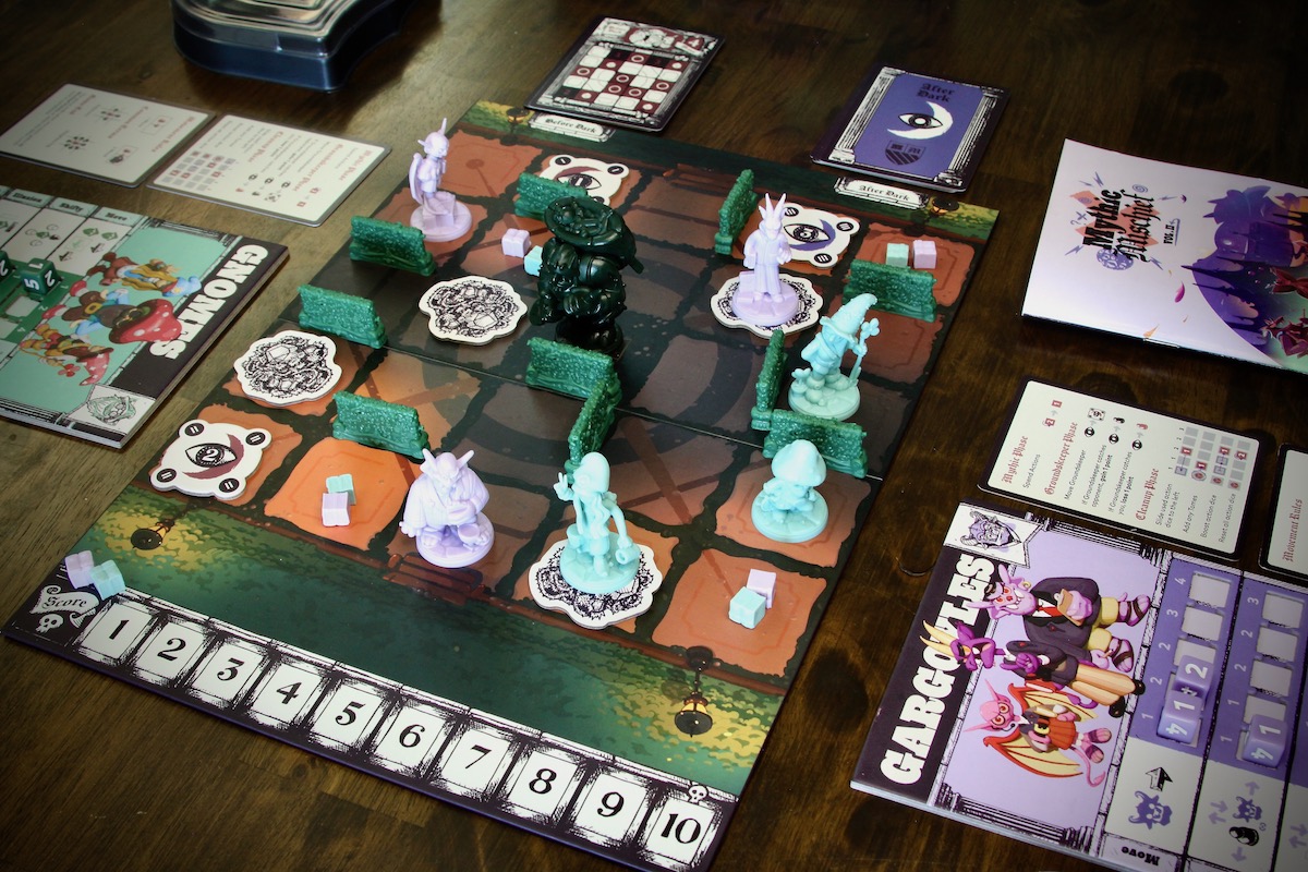 Each player chooses a Mythic faction (Fairies, Werewolves, Gnomes, or Gargoyles) with a board, action dice, Tomes, and three unique student miniatures. The faction board is used for upgrading and determining actions, but all the main actions take place on the Hedgemaze Board, a grid chock full of clutter, hedges, and the constantly moving Groundskeeper.