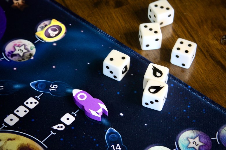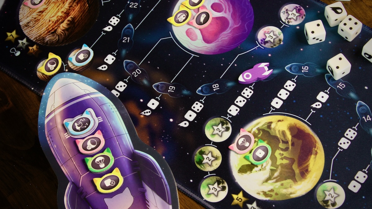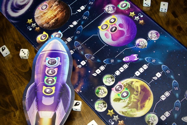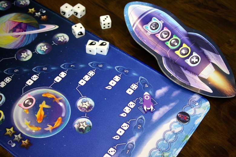 Each round competitors load a cat onto a dice-fueled rocket to travel along the cosmic mat – a neoprene “board” filled with celestial bodies along a singular track. Each space on the track indicates its travel requirement in the form of two or three die faces. Players take turns captaining the ship, taking charge of the rocket’s movements. The captain rolls dice and if any match the travel requirements for that space, they choose which to use as fuel, then discard them. The captain must use the entire group of like dice – they cannot be divided.