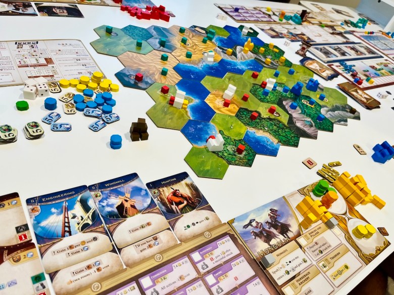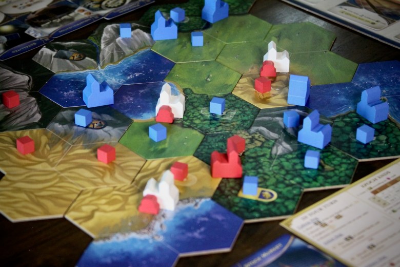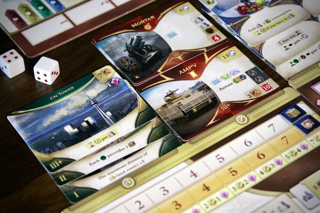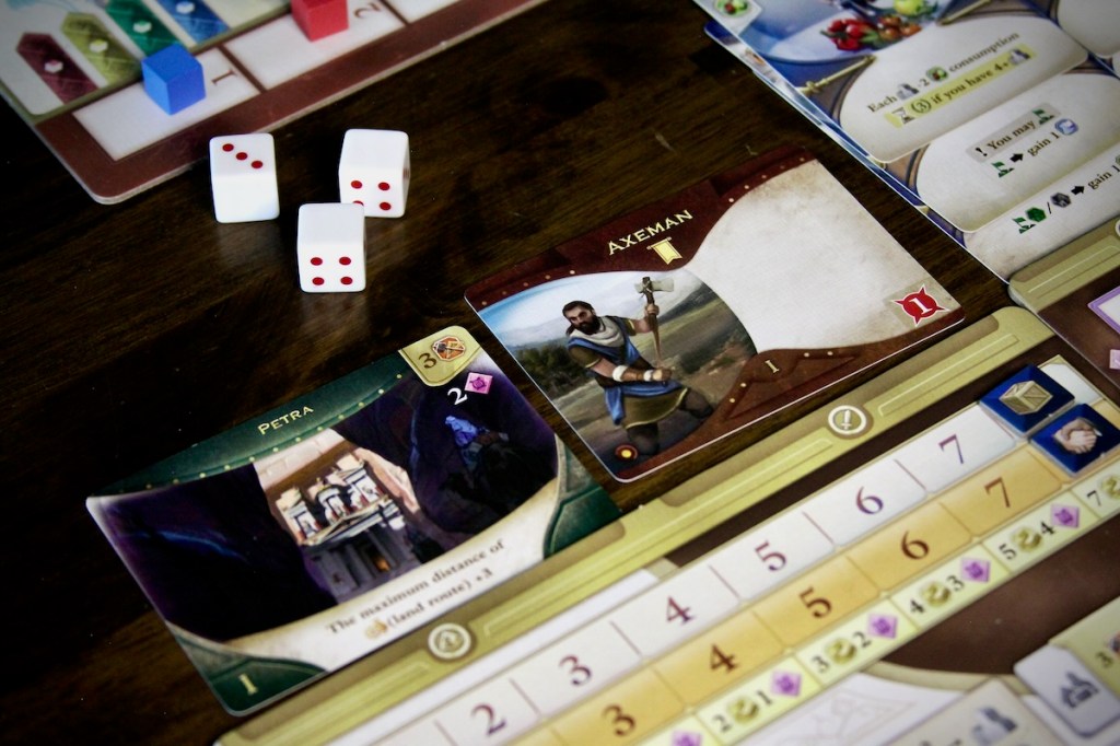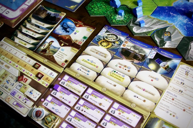 True to its name, this game spans three epochs. Each player guides their society through ancient, medieval, and modern eras, deciding which elements of society to focus on: culture, wonders of the world, government, economy and trade, scientific research, military might… All interact intricately, and finding the right balance to score well is a puzzle.