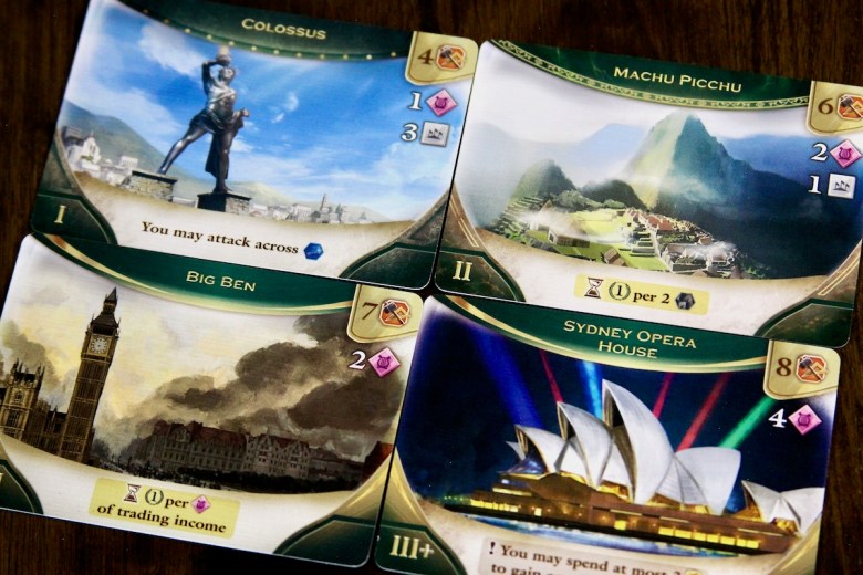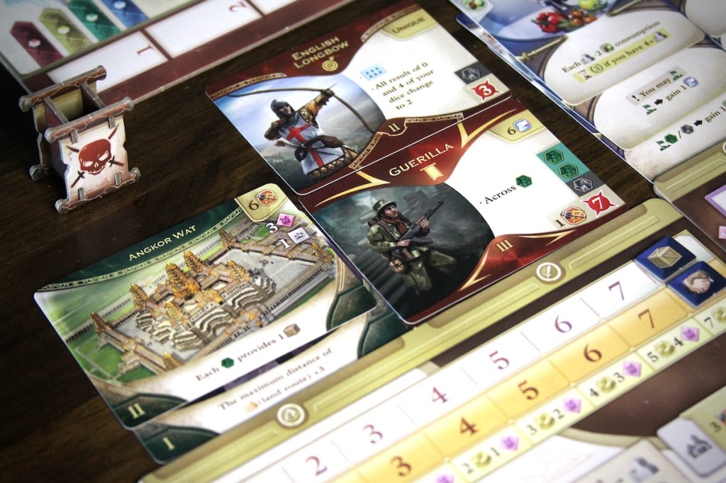Epochs: Course of Cultures lives up to its name, ensuring that each era, ancient, medieval, and modern, feels distinctive. The story of each society is told through the cards. The Epochs have their own inventions, military units, and wonders that work thematically with their era. In the first epoch, you might construct the Great Pyramid of Giza and add chariot archers to your military – by the end of the game you might have built the Louvre and added tanks to your war arsenal. A society that invents the wheel may grow to eventually create the internet, the stock market, or fast food chains.