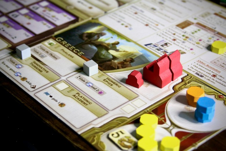 There is interaction on a global scale, too. Inventions bring in resources that benefit neighbors and trading and conquests can shift borders on the map. Each nation will shape the world in different ways, and the world will, in turn, affect its development. There are opportunities for direct conflict through war thanks to the area control element, and there is fierce competition to create a culture that can produce great works of art. Every game writes a unique history – both for the individual societies and the globe. Watching that story emerge through play is a big highlight for me.