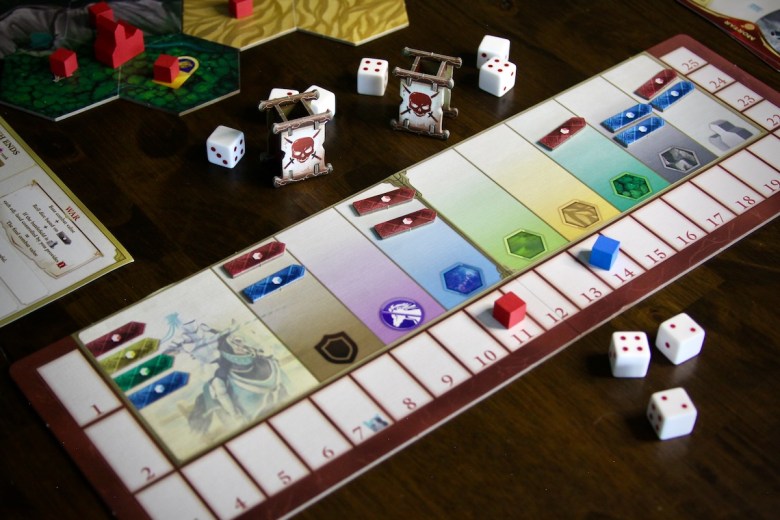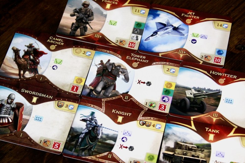 eXterminate – As in, eliminate your competition from the game board. In Epochs the military is abstract. The presence of cities and player cubes indicates military occupation rather than actual troops on the game board. Players may have two active unit cards at once – a primary unit and a support unit. These cards can be upgraded to increase strength and military advantages, which provide additional dice rolls in certain combat conditions. The combined strength of the troops is calculated and added to the military board, along with any strategic advantage(s) they provide. After a battle, the victorious aggressor receives benefits based on the difference in strength, which may allow them to replace cubes/cities with their own.
