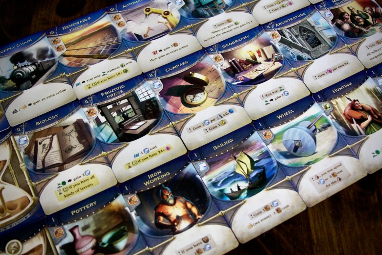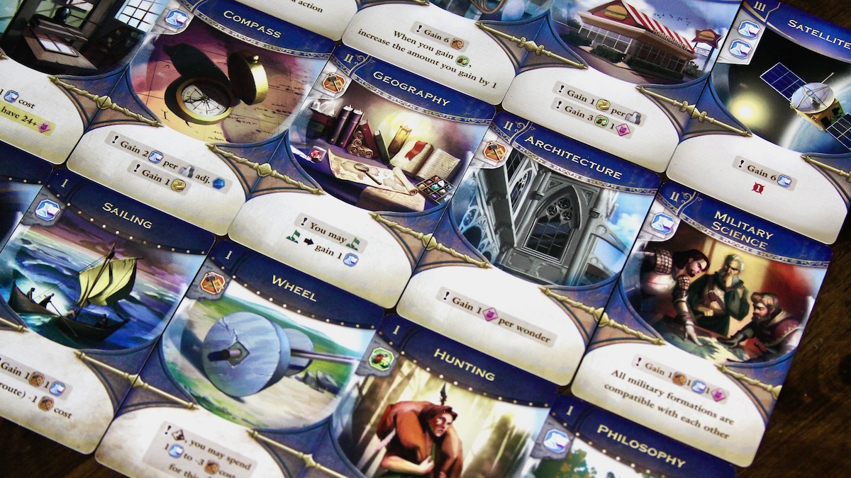 The key to civilization is technology, and what inventions are chosen will form the basis of your society. Players get a sneak peek at their next hand of invention cards as the game progresses, which can help to materialize a strategy for them to work towards. As new epochs are entered, players will access better technologies with more powerful benefits. Each era lasts six turns, three of which involve inventing new technologies that provide immediate and often recurring rewards.