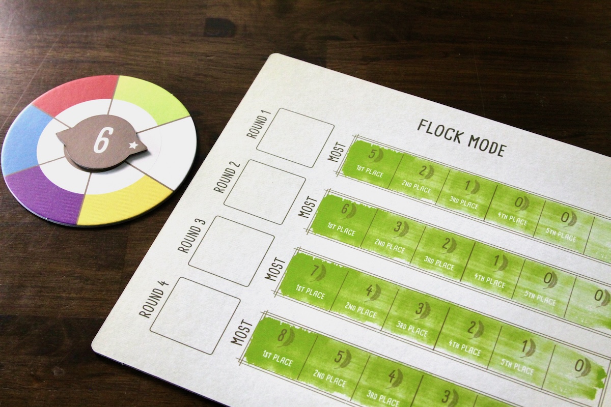 Duet mode runs very similarly to the base game. The most significant change is the addition of the Duet Board which adjusts round and end-game scoring. The original round goal mat is replaced with the Duet Mat and a set of end-of-round tiles specifically for the mat. As birds are placed in habitats, players have the opportunity to put one of their duet tokens in an unoccupied space on the mat. The token can be placed anywhere, assuming the bird placed is in a matching habitat and has the quality listed on the space (nest type, food preference, beak position, etc). The tiles are randomized and placed on the mat as round goals, and the player who has met the most requirements secures the victory points for that round. At the end of the game, each player scores for their largest cluster of contiguous tokens on the mat (along with the other scoring parameters, such as round goals, eggs, tucked cards, etc.).