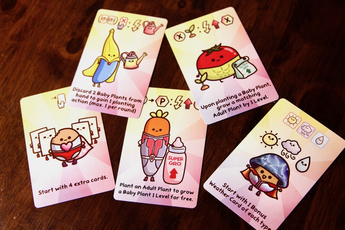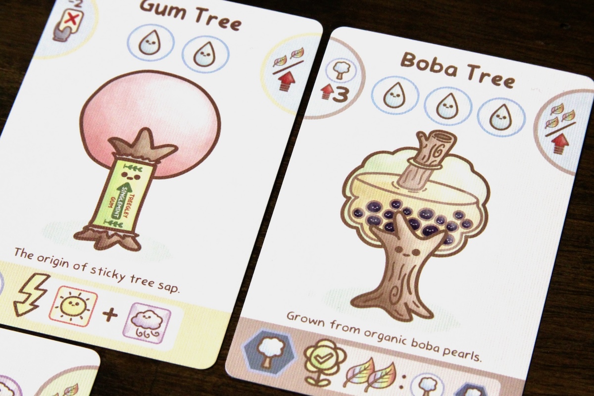 The planting phase begins with each player drawing a card and taking a single action: playing (or “planting”) a card, leveling up multiple planted cards, or drawing new cards. Cards can be discarded as fertilizer to plant and grow cards. To create an adult plant, a planted baby must be sacrificed to “treevolve” it into its adult form.