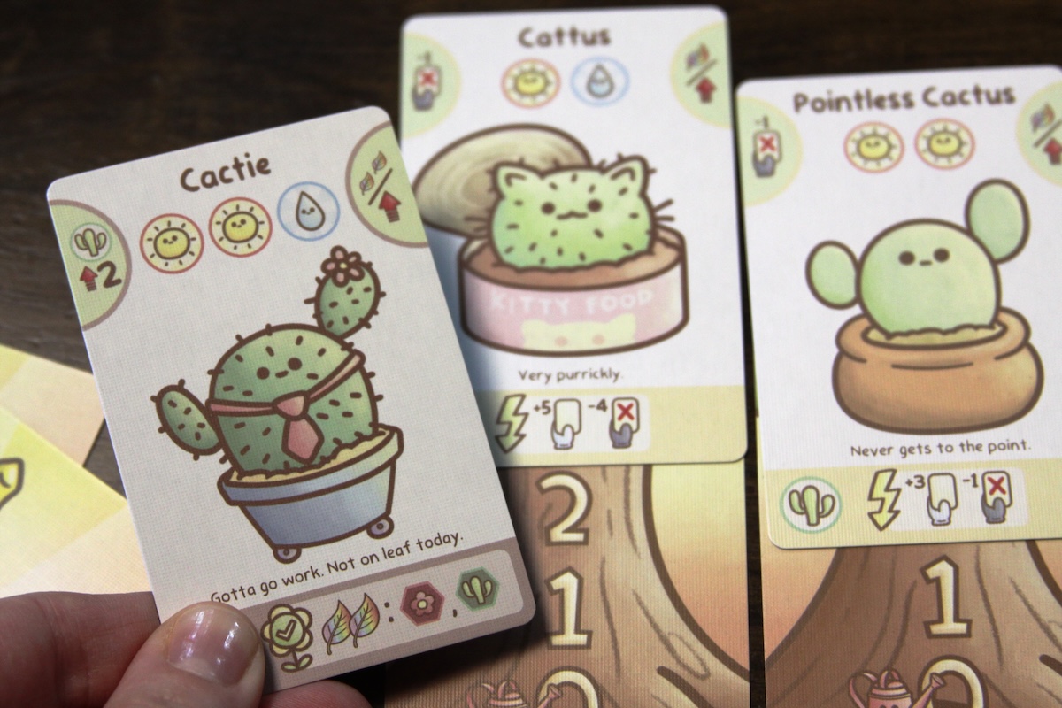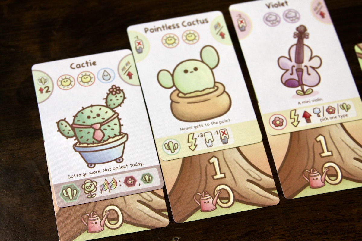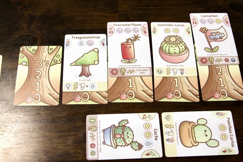 The cards are full of simple, punny, anthropomorphic plants. The cards are easy on the eyes, thanks in part to the soothing pastel color palette and adorable illustrations. The card layout is pretty clean with planting/growth requirements on the top right, card points on the top right, and info on the plants’ abilities on the bottom. The cards are color-coded based on category (cacti, tree, and flower) and whether the plant is a baby or an adult is indicated by a yellow or brown bar on the bottom, respectively.