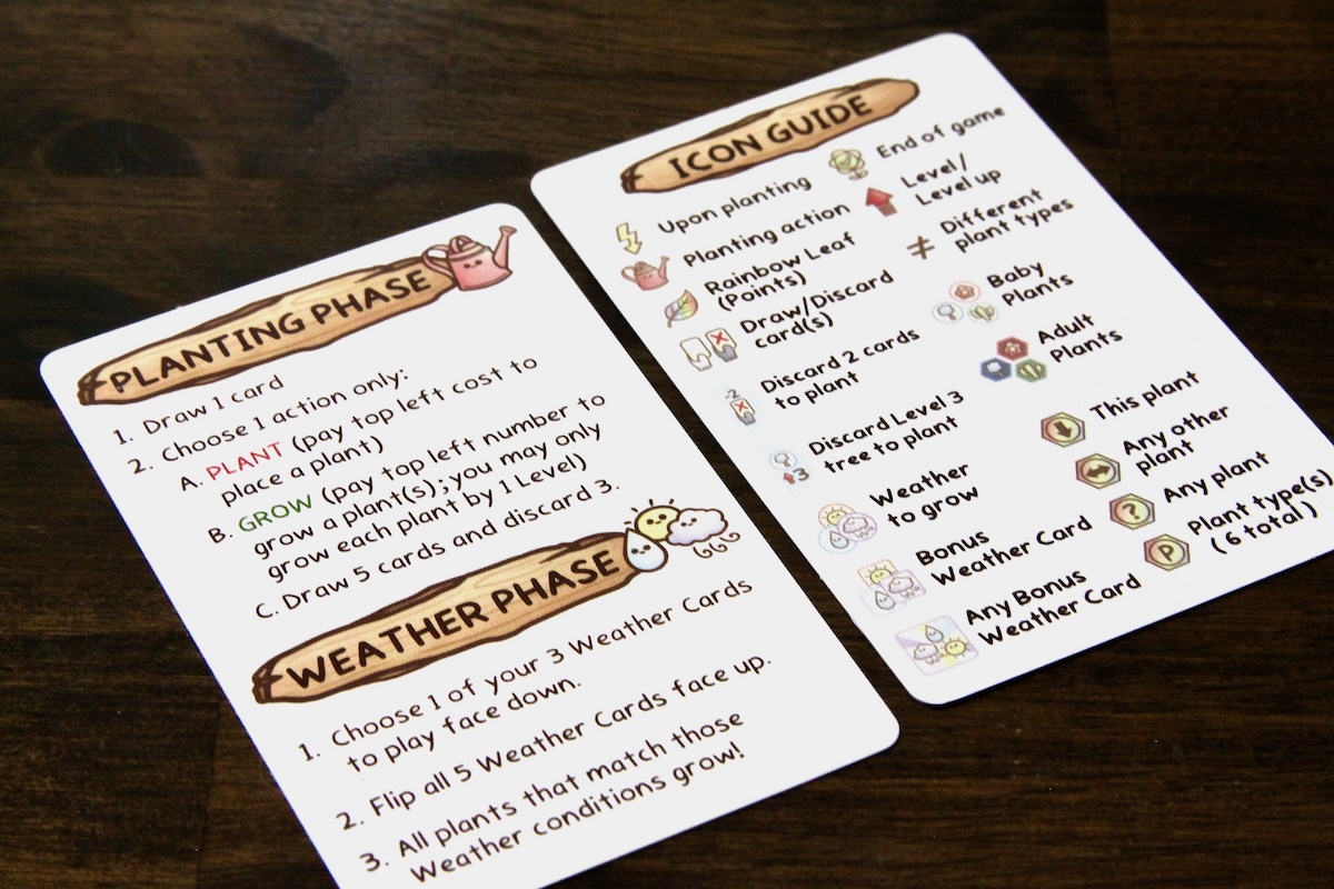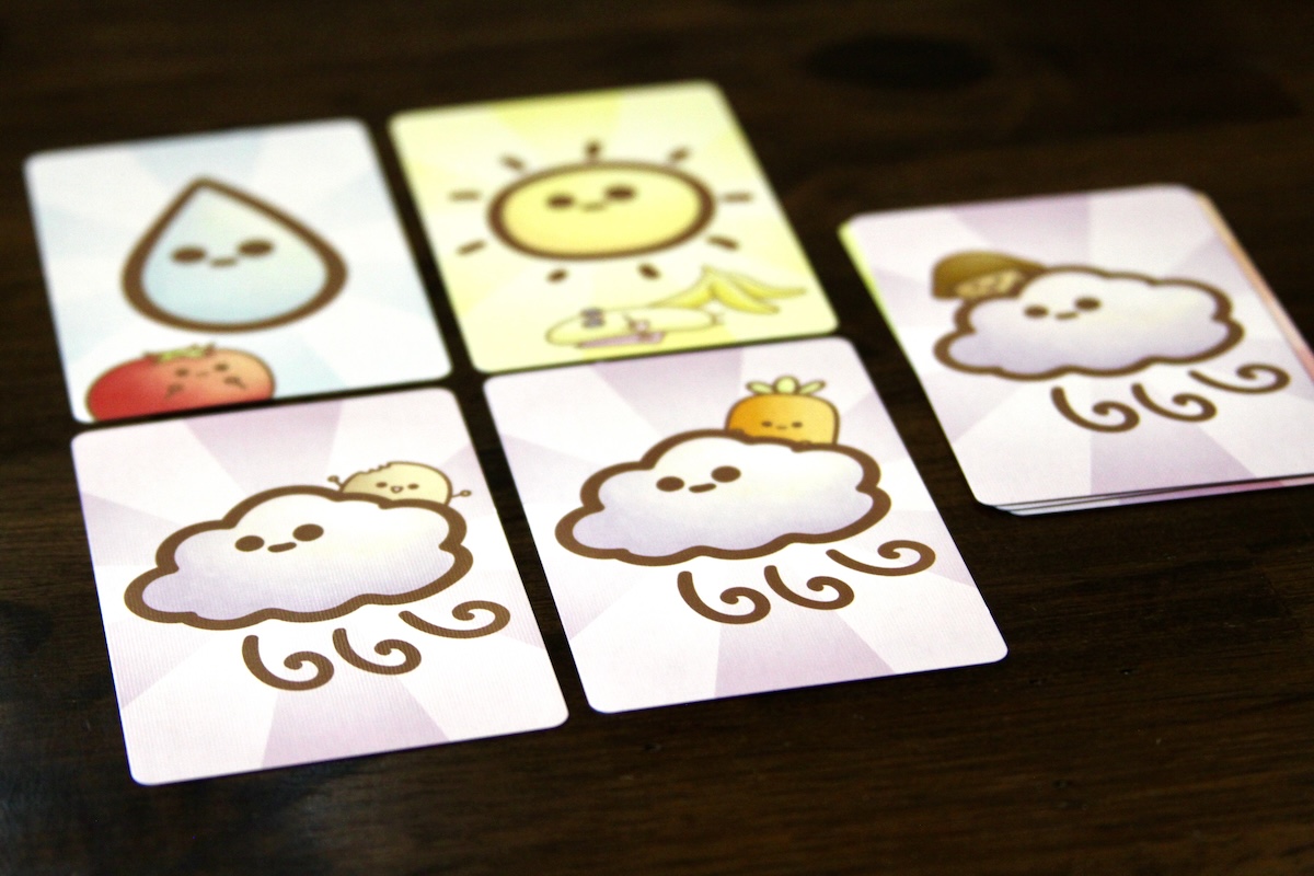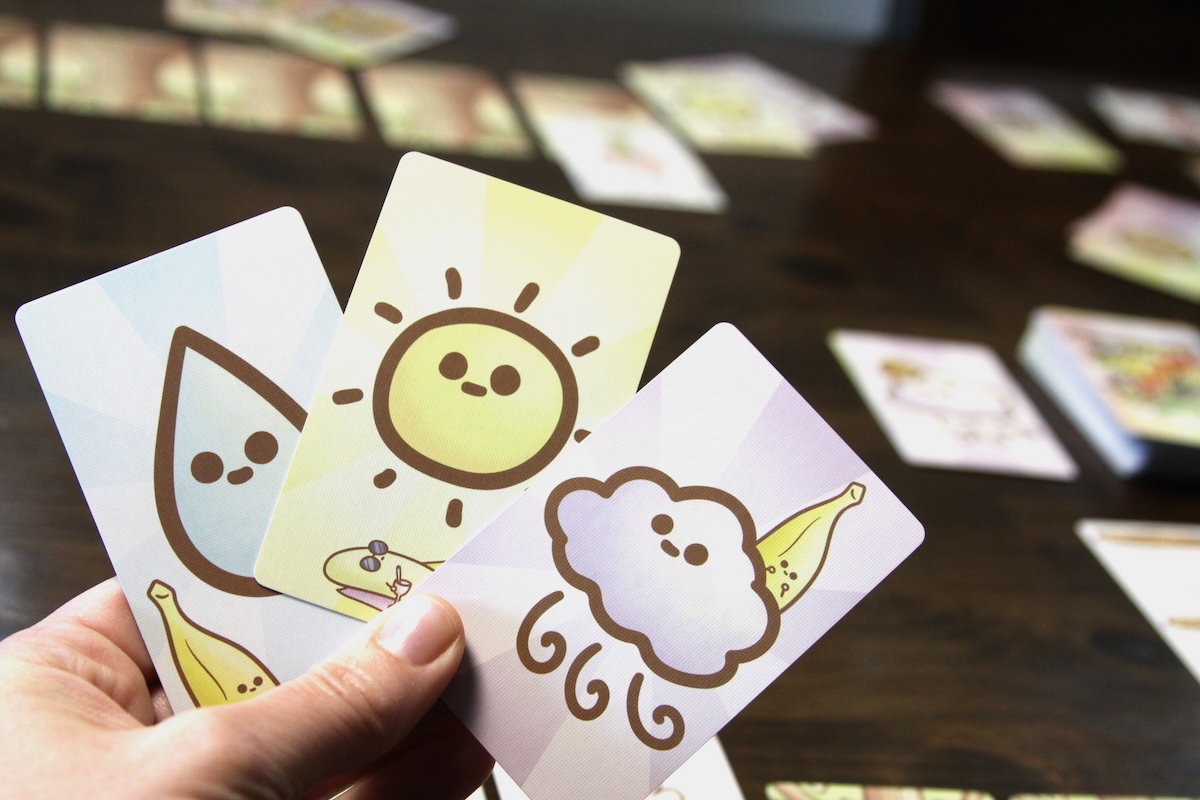 In the weather phase players contribute one of their weather cards, face-down, to the forecast to be revealed simultaneously. If the weather is favorable, your planted cards will grow.