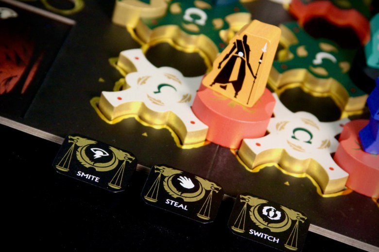 There are nine demigods to interact with. While each player is only concerned with two, they will still interact with the other seven to achieve their goals. Each action conveys information. You will be left wondering if placements were done for the action bonus, for the point potential offered by the neighboring quest tiles, or for deception. More information is revealed at the end of each age with a significant information dump – the reveal at this stage adds another layer of strategy to consider while manipulating the demigods. Even the use of God Powers may shed light on a player’s intentions. Guarding your secrets and playing mind games is at the heart of this game.